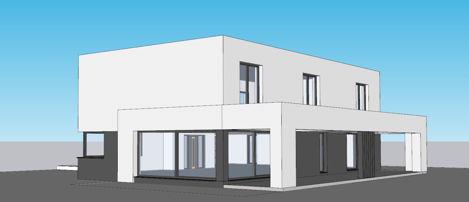 minimalism style white and dark gray plaster walls dark gray windows curtains in the windows photorealistic grass low size plants