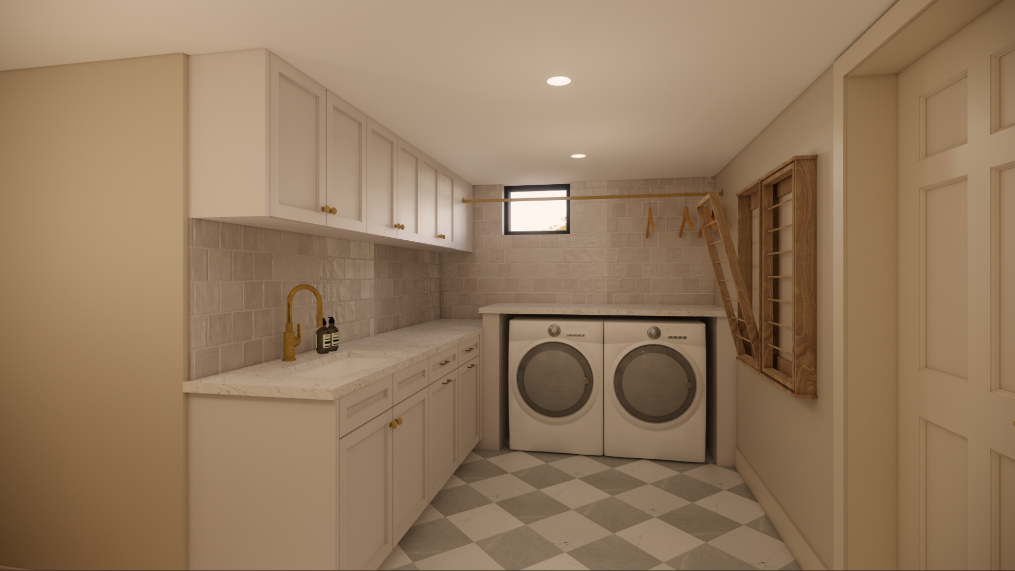 the small window close to the ceiling change the color of the window frame to white and add a window grid