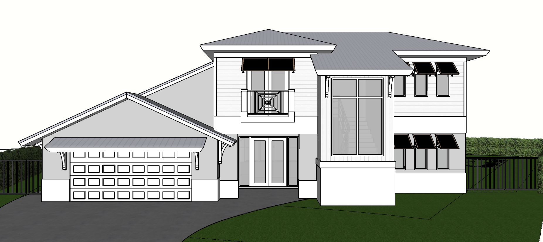 a florida coastal two story house exterior with a clean and elegant aesthetic the walls are painted in a light gray with a smooth stucco finish and off white siding the metal roof features a light gray with a subtle metallic sheen the windows are large and framed in sleek white offering a striking contrast the garage door and trim are finished in a crisp white enhancing the modern feel the front suburban yard is landscaped with lush green grass ornalmental grass flowers and trimmed hedges adding a touch of nature the atmosphere is serene and inviting with soft natural lighting highlighting the architectural details