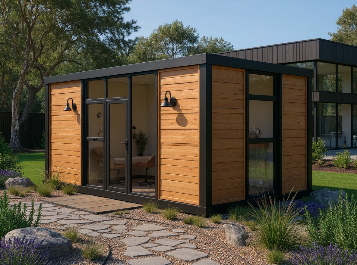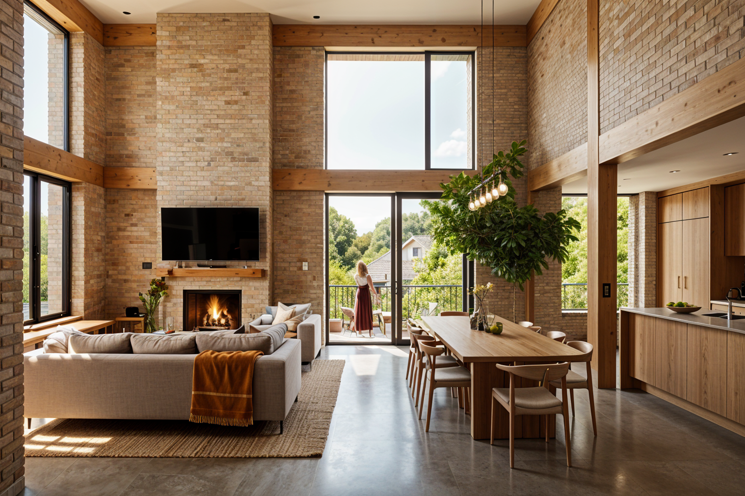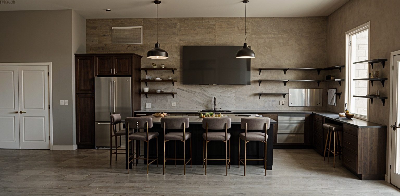 stage this modern rustic kitchen to feel like a lakeside lounge with a warm stone backsplash linear black metal brackets holding up the walnut wall shelves flooring will be polished cement add three pendants over the kitchen island all window need to remain in their current locations