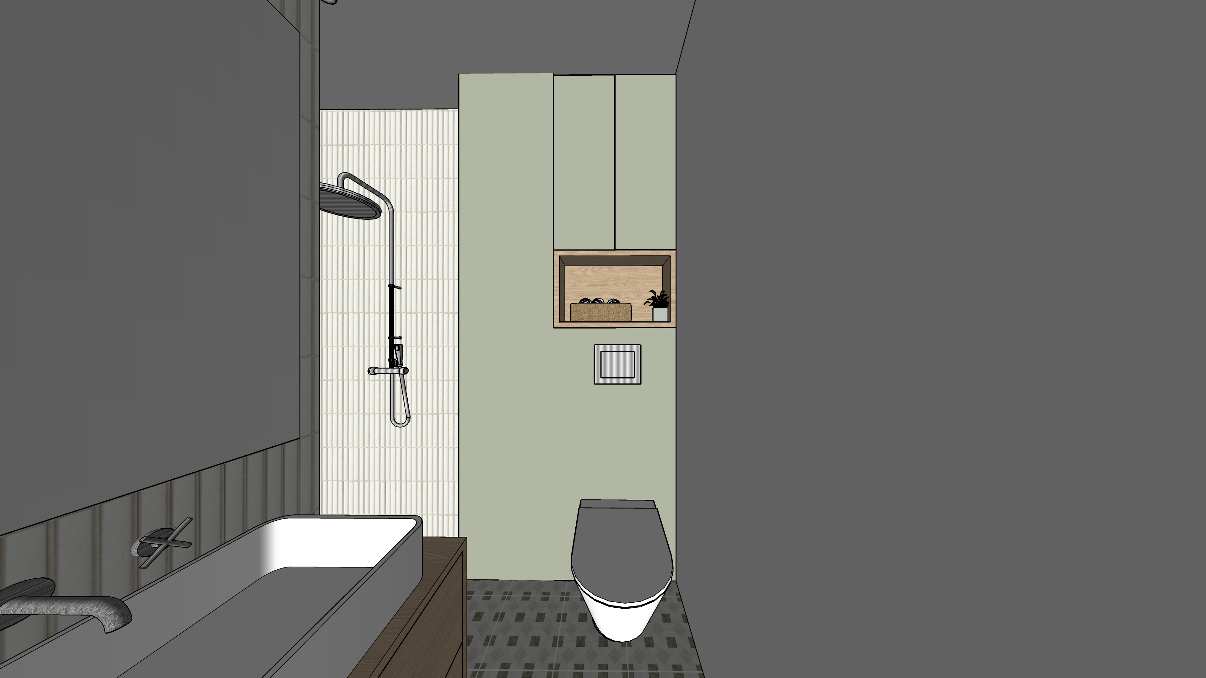 this is the bathroom of the apartment the floor tile has a specific pattern that you should maintain the wall tiles are linear white the grout joint is light grey the sink furniture is light oak wood the walls are white and light green from benjamin moore code saybrook sage hc 114 please keep all geometry and material as it is the door on the left side of the image is white the wall where the sconce is painted white keep the color and pattern of the tile as it is