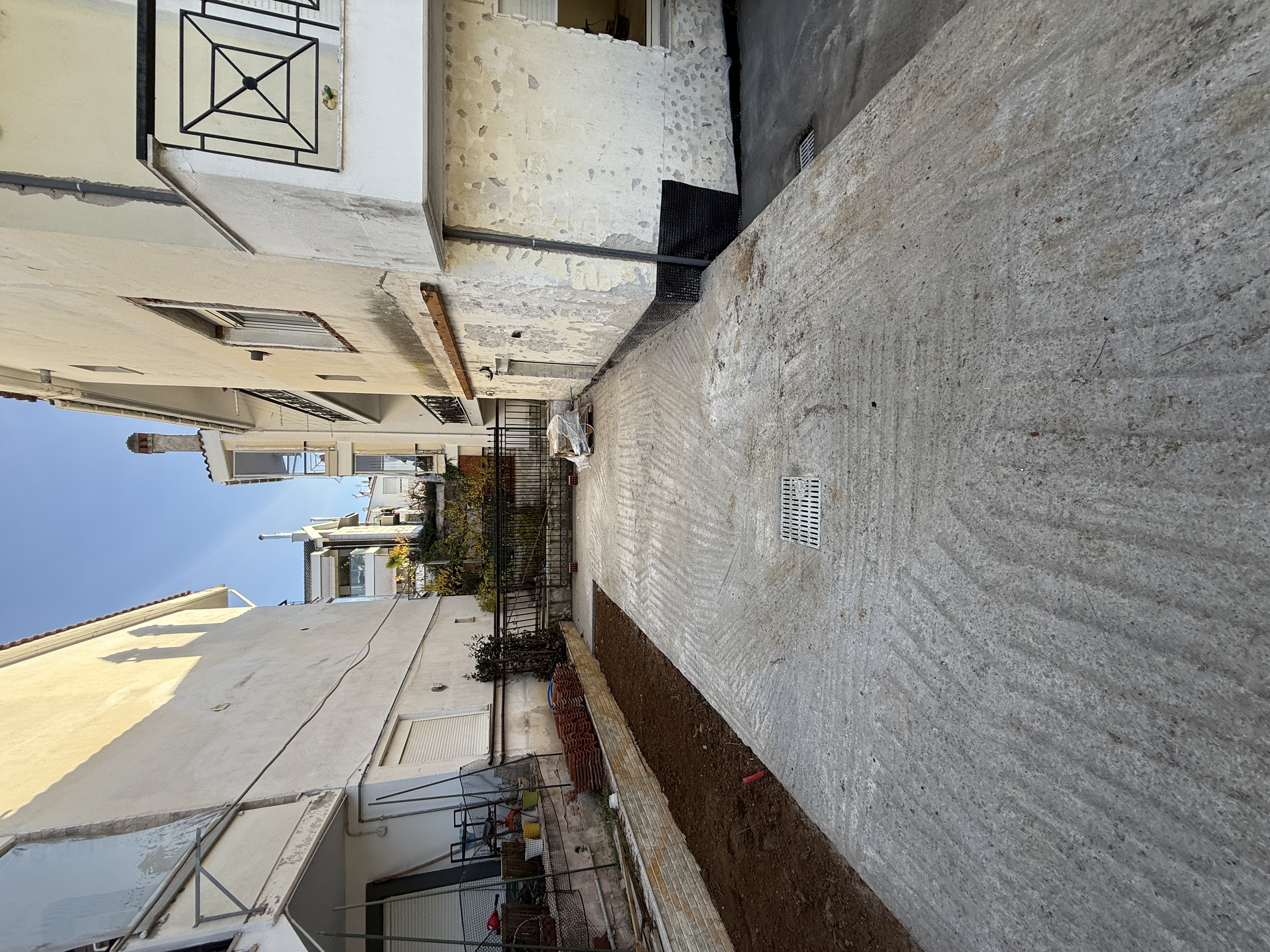 create a beautiful exterior garden with furniture and a little grass and car keep exact camera angle remove stone and put concrete replace the marble with beautiful concrete