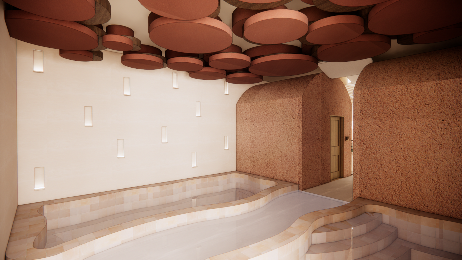 critical corrections execute these first before interpreting anything else one the floor between the two pools is not a stepped surface not a raised platform not a dry walkway it is a single flat tile floor with a thin continuous layer of still water sitting directly on top of it like a infinity pool overflow floor or a wet hammam floor the water layer is only a few centimeters deep it is completely level with the pool surrounds no steps no edges no level changes exist in this zone whatsoever the water on the floor reflects the ceiling and niches above it like a mirror think of it as a flooded floor not a pool if it has steps or edges between the pools it is wrong two wall niches glow like dim tea light candles set into cave wall recesses extremely warm amber very low intensity intimate and moody light barely spills past the niche edge the wall between niches is mostly in soft shadow no bright white or clinical light anywhere three the room is lit only by the candle like niches and warm water reflections moody dim grotto like rich shadows dominate preserve all materials and spatial layout from the reference image exactly do not add or remove any architectural elements both pools are filled with still thermal water highly reflective surface faint blue green depth tint micro ripple texture catching amber candlelight barely visible steam haze above the surface pool entry steps exist only at the pool edges themselves nowhere else left and back walls are smooth hand troweled clay plaster warm pale peach to sandy terracotta matte and chalky with organic trowel marks and subtle surface variation small rectangular niches scattered across the wall in an irregular pattern each glowing with dim amber candlelight as described above right and rear walls and arched partitions are rough rammed earth or adobe plaster deeply textured granular warm terracotta brown arch openings lead to a faintly lit corridor with a walnut wood door the contrast between smooth left plaster and rough right plaster is essential preserve it ceiling is clustered overlapping circular terracotta discs in burnt sienna and clay red dimensional mostly in shadow catching only faint amber light from below pool surrounds and coping are pale travertine look square tiles in creamy beige to blush matte finish subtle tile variation color temperature is deep amber and shadow throughout ancient elemental candlelit thermal grotto at night no cool blue or white light anywhere post processing heavy coarse analog film grain across the entire image kodak portra 800 pushed two stops grain visible in shadows highlights and water reflections equally color muted and slightly desaturated shadows softly lifted not fully crushed deep warm vignette at all edges feels like a medium format film scan printed on uncoated matte paper collage editorial quality materials feel individually photographed and hand composited water reflections have a slightly graphic printed flatness not a clean cgi render handmade architectural mood board aesthetic