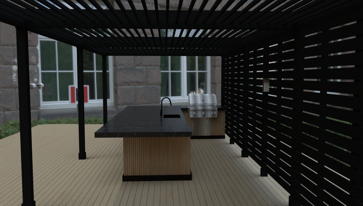 ultra realistic modern outdoor pergola with a matte black powder coated steel structure and black trim clean architectural lines black marble countertop with subtle natural veining soft polished reflection and realistic stone texture front of the bar clad in wood look matte fluted porcelain tile with vertical ribbed detailing natural tone variation and material depth horizontal slatted privacy wall in matte black finish with subtle surface texture integrated wall sconces casting gentle architectural shadows across the slatted wall timber deck boards with realistic wood grain slight tone variation natural spacing and soft weathered texture bright natural daylight with soft diffused lighting realistic hdri sky illumination physically based rendering global illumination ambient occlusion realistic shadow softness architectural photography eye level perspective 35mm lens shallow depth of field balanced exposure true to life colours photorealistic high detail 8k resolution no furniture no led strip lighting no dramatic sunset lighting no redesign of structure