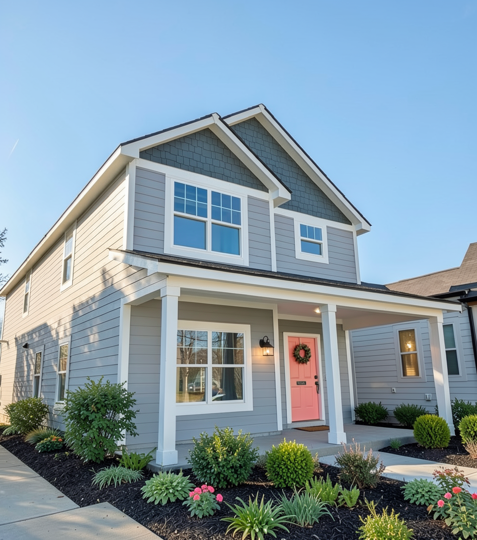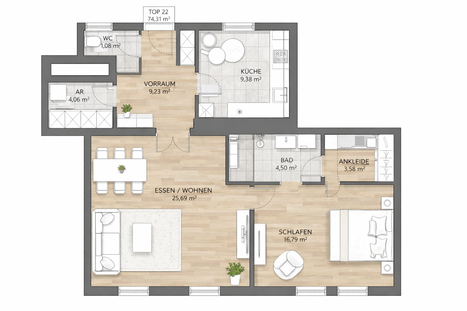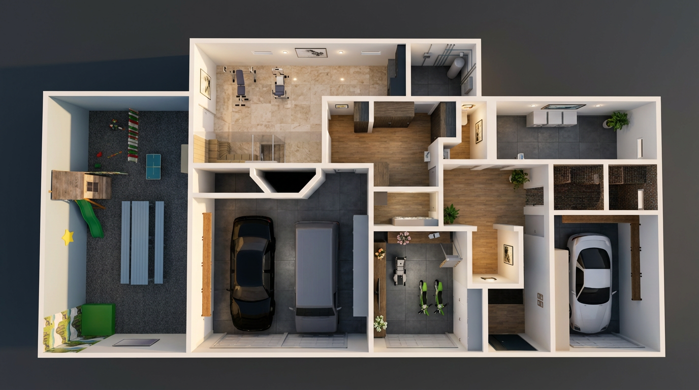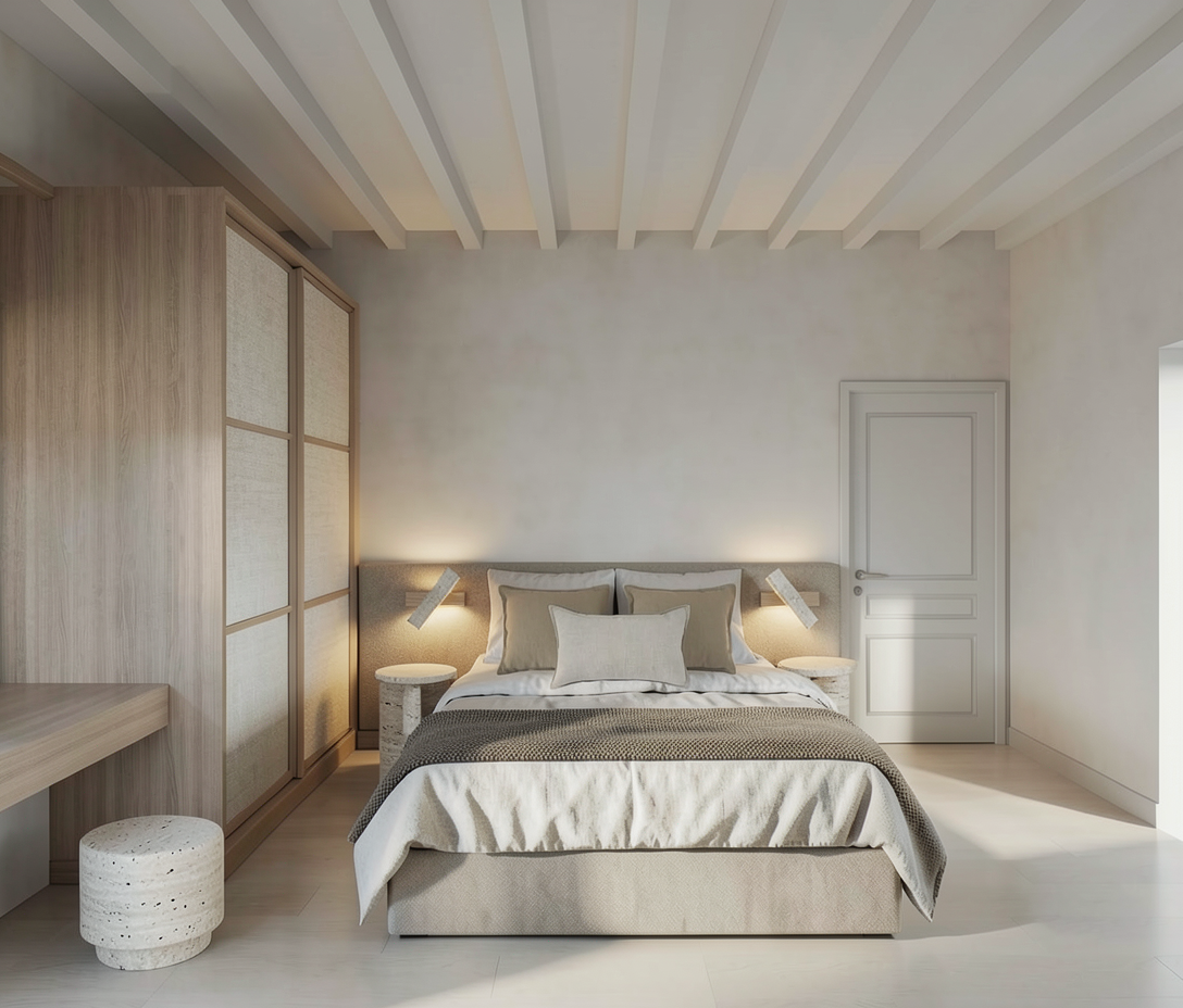 render a modern interior architectural space with high ceilings and large windows use soft beige for the walls and a warm light gray for the floor the window frames should be a sleek dark gray illuminate the scene with natural daylight streaming through the windows creating a bright and inviting atmosphere add subtle reflections to the glass and a hint of greenery outside enhancing the serene and open feeling of the space add a translucent canopy hanging from the ceiling like the one in the reference image