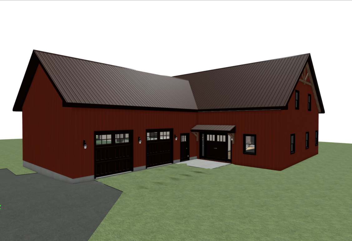 a cinematic ultra realistic aerial rendering of a modern red barndominium with black standing seam metal roofing black trim and black garage doors retain all architectural details including rooflines dormer front entry awning windows and concrete apron with accurate proportions and textures capture the scene from a slightly elevated wide angle view that showcases the full layout and roof design bright sunlight filters through surrounding tree branches casting soft highlights and natural shadows over the roof and lawn the barndominium is surrounded by lush green grass mature trees and distant wooded hills giving a sense of privacy and rural serenity emphasize realistic materials reflections and depth creating a warm aspirational image perfect for marketing brochures listings or web hero banners
