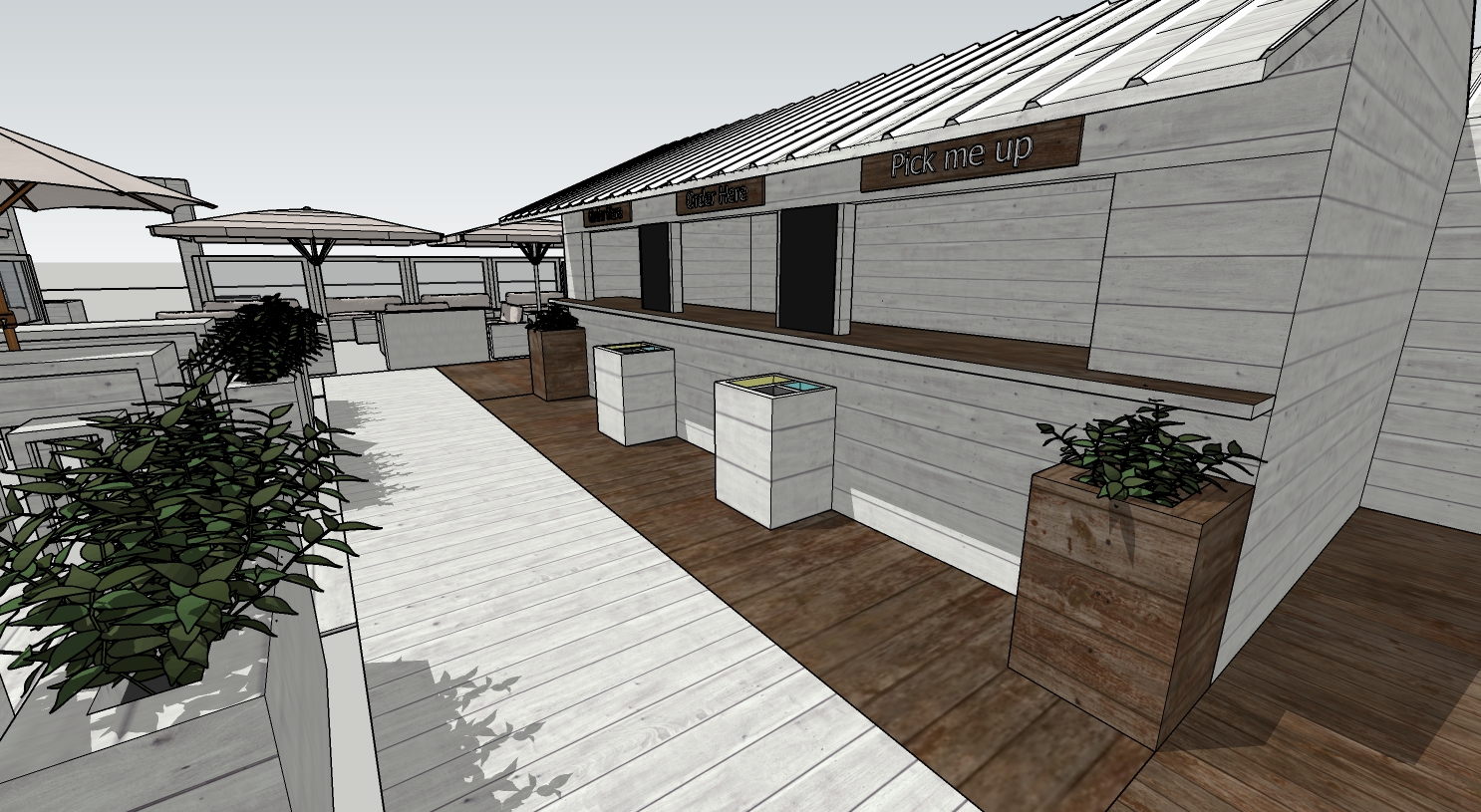 het betreft een strand bar voorzie mooi wit geverfde houten planken graag fotorealistisch in de verre achtergrond links is de zee graag toevoegen van veel mensen die genieten van een lekkere cocktail en aan de bar staan aan te schuiven in strandkledij graag ook personeel achter de bar zetten en de bar inkleden volgens een echte zomerbar