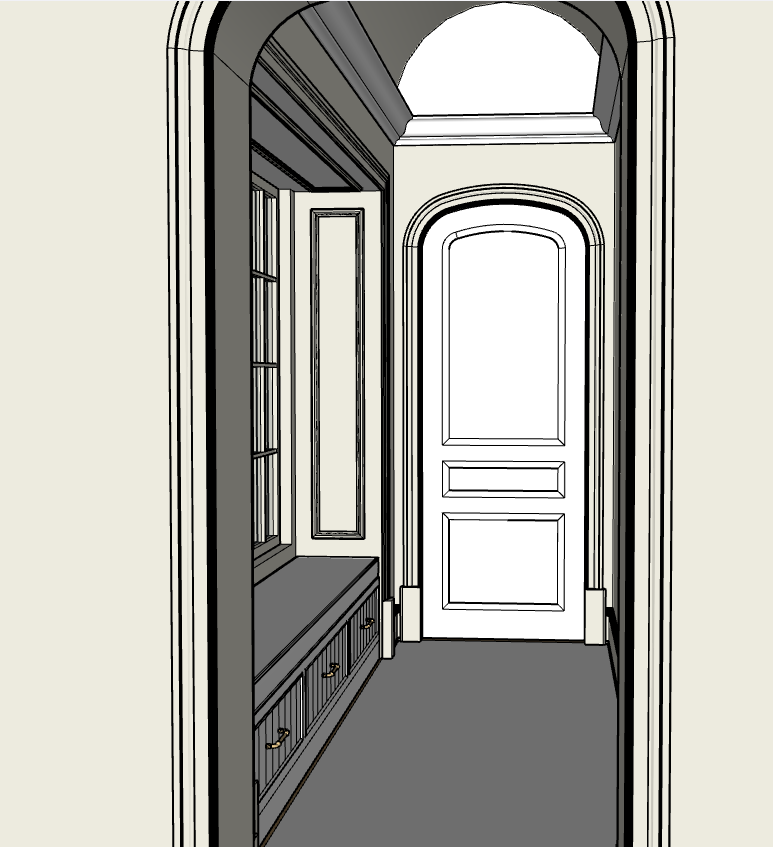 exterior shot barrel vault wood ceiling wood floors wallpaper on walls painted paneling at window seat