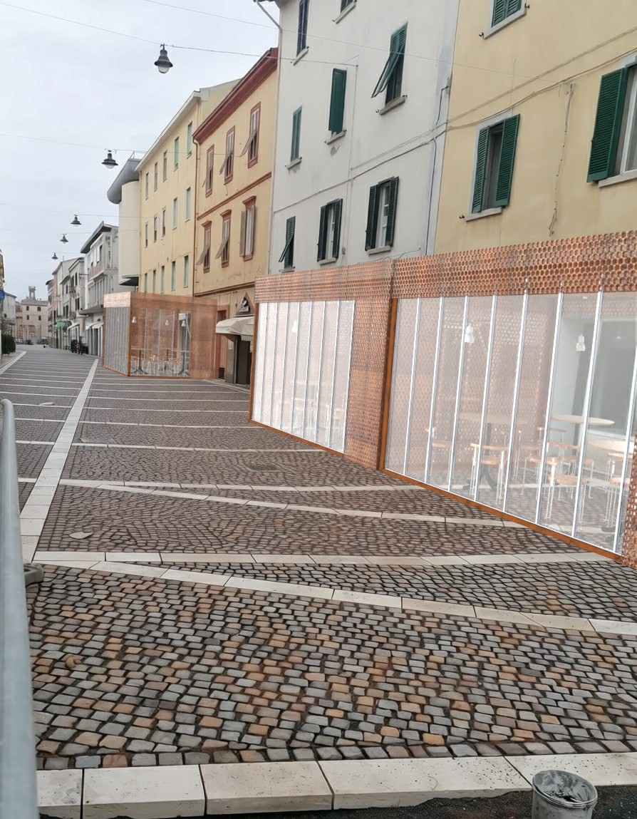 fai grigliato di un gazebo colore salvia fai colore grigliato degli altri gazebo colore celeste pallido metti turisti mantieni tutto