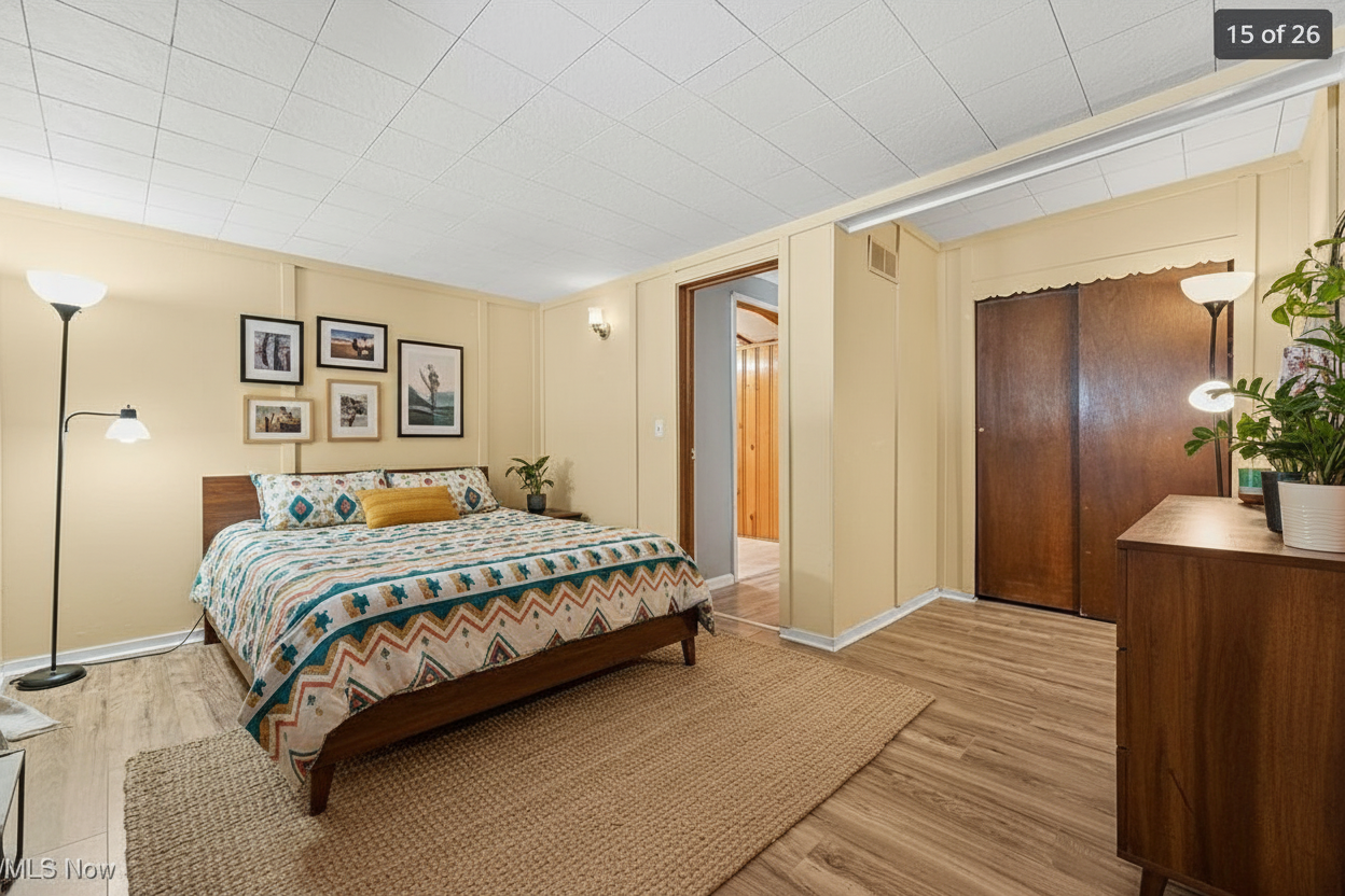 update this bedroom to have an off white colored paint color a queen bed with a rug and a stylish dresser include a new floor lamp and decorate with house plants and framed photos on the walls paint the ceiling to create a warmer atmosphere