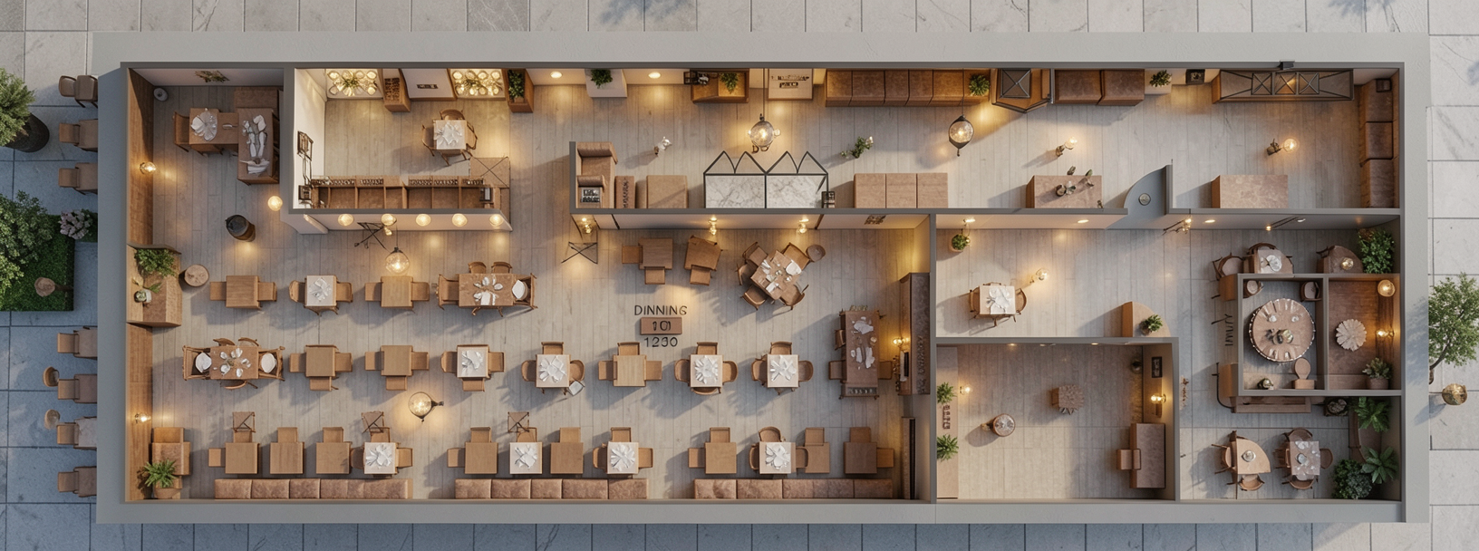 convert this restaurant floor plan into a realistic overhead 3d visualization of a completed italian restaurant interior show the space from a high top down architectural perspective similar to a dollhouse style interior view where the full restaurant layout can be seen clearly instructions maintain the exact layout and orientation of the floor plan keep walls and architectural elements straight and consistent with the plan ignore all architectural annotations including dimensions labels arrows and technical drawing elements do not display any text or symbols interior environment design the restaurant interior with a warm italian dining atmosphere appropriate for a place like dal milanese in los angeles include elements such as dining tables and chairs arranged according to the plan booth seating where appropriate bar or service counters warm wood or stone finishes decorative lighting fixtures subtle d cor elements typical of italian restaurants if outdoor seating or patio areas exist include outdoor dining tables and sidewalk context rendering the camera should remain above the floor plan showing the entire restaurant clearly focus on seating density circulation flow relationship between dining areas and kitchen service zones style high quality architectural visualization warm restaurant lighting detailed interior materials realistic textures clean professional presentation avoid chairs outside the lines