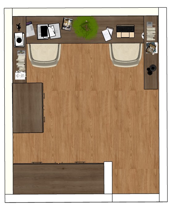 top down orthographic view of a contemporary home office strictly based on the provided 3d model preserve the exact layout geometry proportions and furniture placement without adding removing or modifying any elements maintain the l shaped desk configuration attached directly to the walls with no gaps between the desk and surrounding walls accurately preserve all materials textures and colors medium dark wood for the desk surfaces light wood flooring with visible grain and neutral light colored walls do not alter material tones or finishes on the surface keep all existing objects exactly as placed notebooks papers smartphone coffee cup desk accessories and decorative elements the workspace is designed for two people with two chairs positioned on different sides of the desk maintain their exact position and orientation ensure all decorative items remain unchanged including the plant speakers lamp and small objects distributed across the desk do not add new objects or remove any existing ones lighting must remain neutral and uniform with no dramatic shadows no added artificial lighting effects and no change in brightness or contrast keep a clean evenly lit presentation consistent with an architectural diagram or stylized render camera must remain strictly top down 90 degree orthographic view with no perspective distortion no tilt and no cropping the full layout must be visible within the frame render with high clarity sharp edges and clean definition emphasizing a professional architectural visualization style