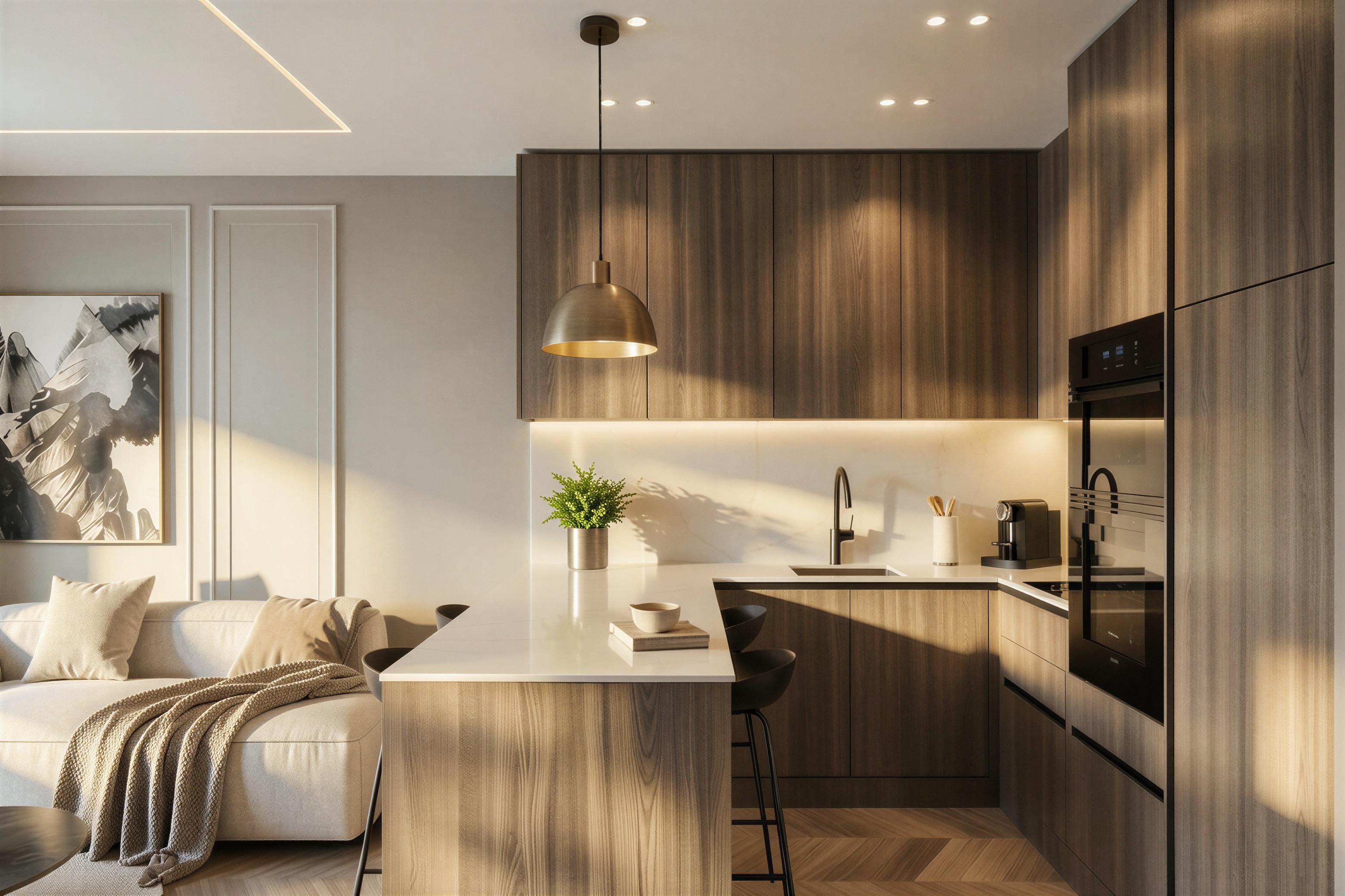 keep the exact same kitchen design layout cabinet proportions island appliances wall paneling lighting camera angle and overall composition do not redesign anything and do not move any elements change only the upper wall cabinets the ones above the countertop highlighted area to a soft warm cr me color the finish should be matte lacquer or matte painted mdf smooth elegant and slightly warm not pure white not yellow think warm ivory soft cream tone refined and minimal keep all other cabinetry exactly the same as before lower cabinets same wood tall units same wood island same wood side panels same wood do not change the wood tone anywhere else keep the countertop and backsplash in soft off white stone keep black appliances black faucet and lighting as is maintain realistic lighting soft shadows and high end render quality important only the upper cabinets change to cr me everything else must remain identical negative prompt restriction do not change lower cabinets do not change tall units do not change island no white color no glossy finish no redesign no layout changes