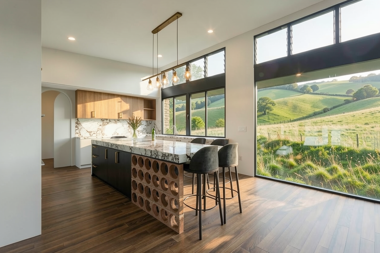 provide new modern kitchen remove objects from benchtop and fridge provide dark marble benchtops provide new modern joinery finishes