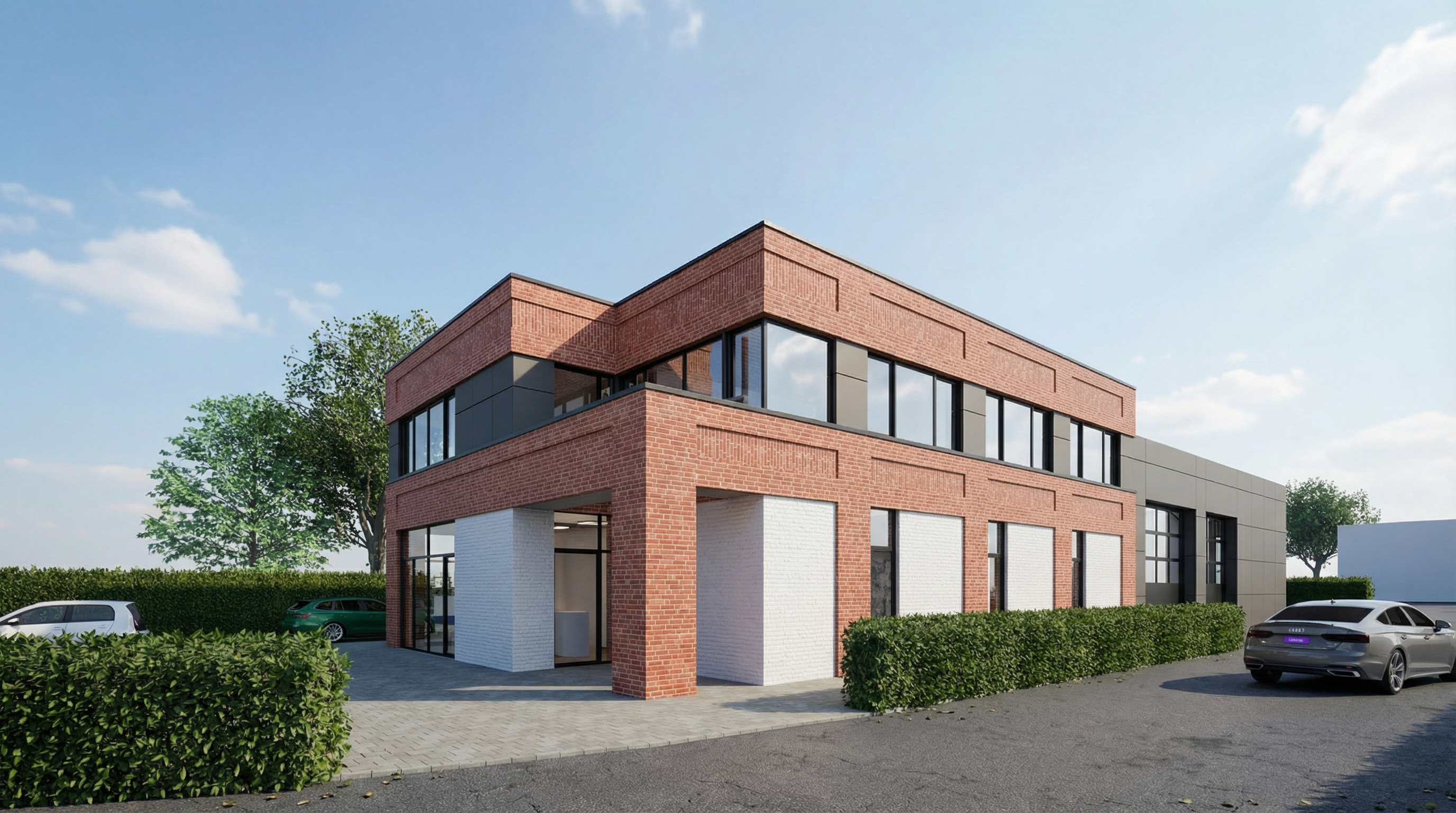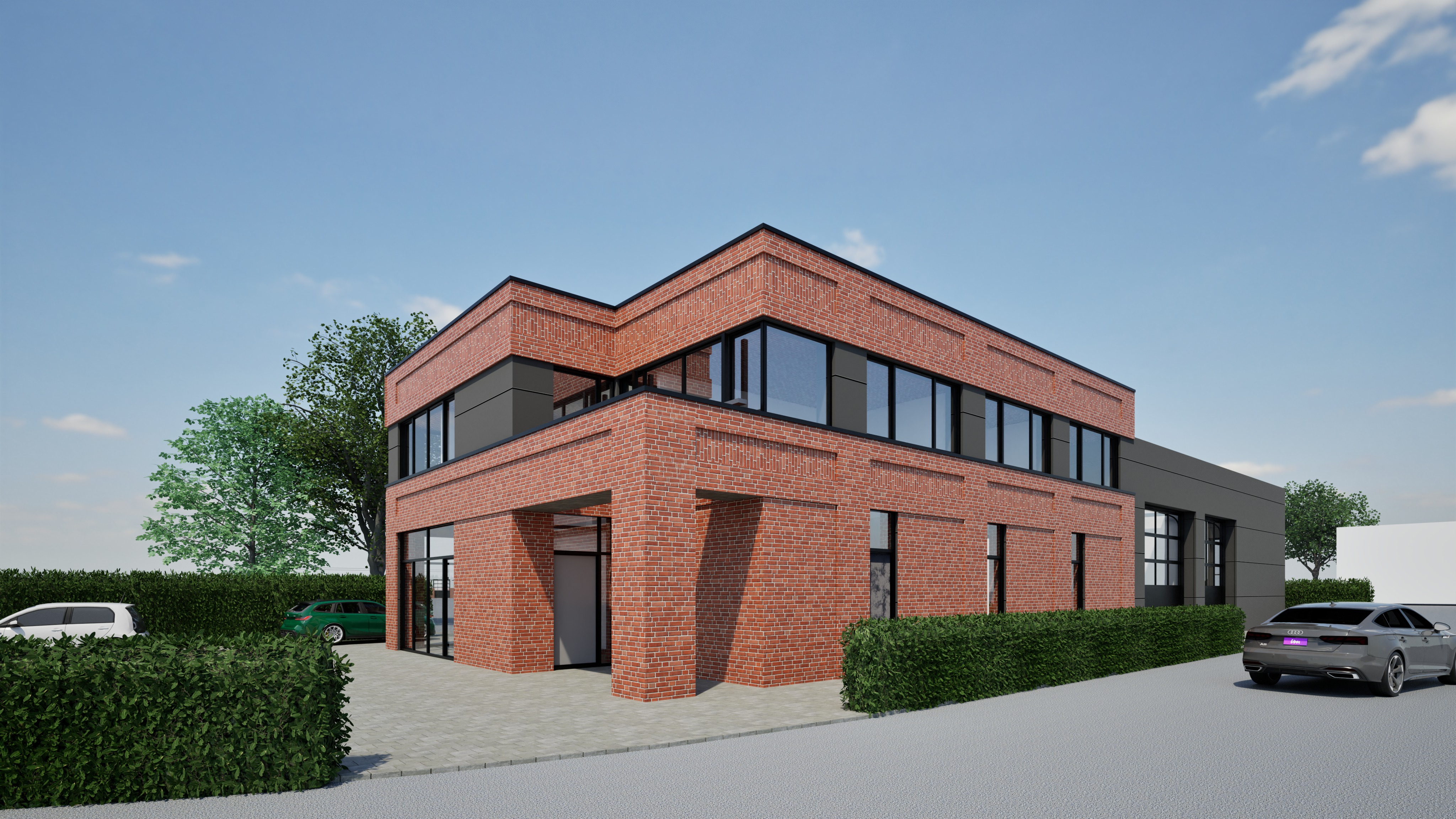transform this rendering into an ultra photorealistic architectural photograph shot in summer bright atmospherical light preserve exact geometry materials colors and composition from the original image enhance only real world material behavior natural reflections roughness variation subtle imperfections apply physically accurate daylight soft shadows realistic global illumination professional architectural photography look 35 50 mm lens straight verticals natural exposure no cgi look indistinguishable from a real photo korregiere leichte fehler im rendering und stelle die klinkertexturen nahtlos dar erg nze realistisches glas durch das man etwas innenraum erkennen kann stra e mir fu g ngerweg und boardsteinabsenkung zwischen den hecken die graue fassade ist anthrazithes belch