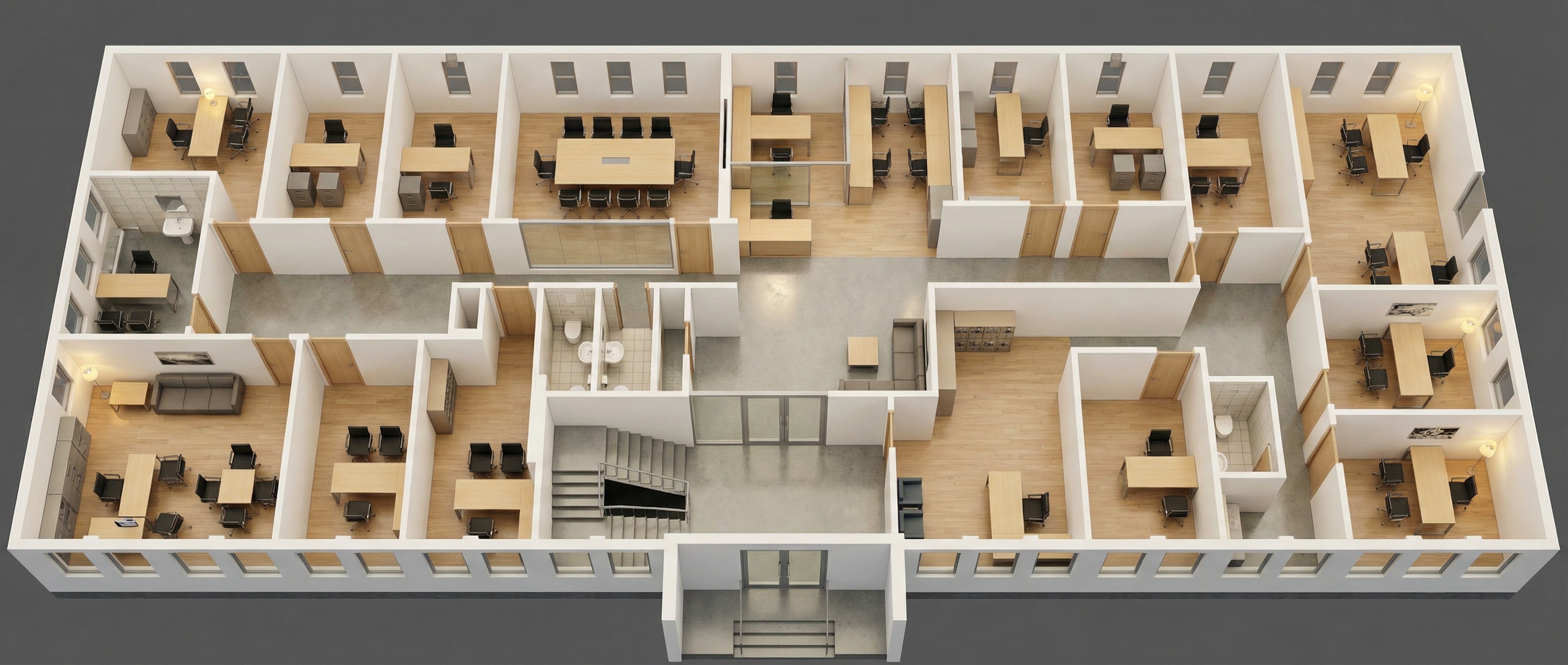 make all the common areas floor in light wood color vinyl and all the closed offices in grey carpet tiles