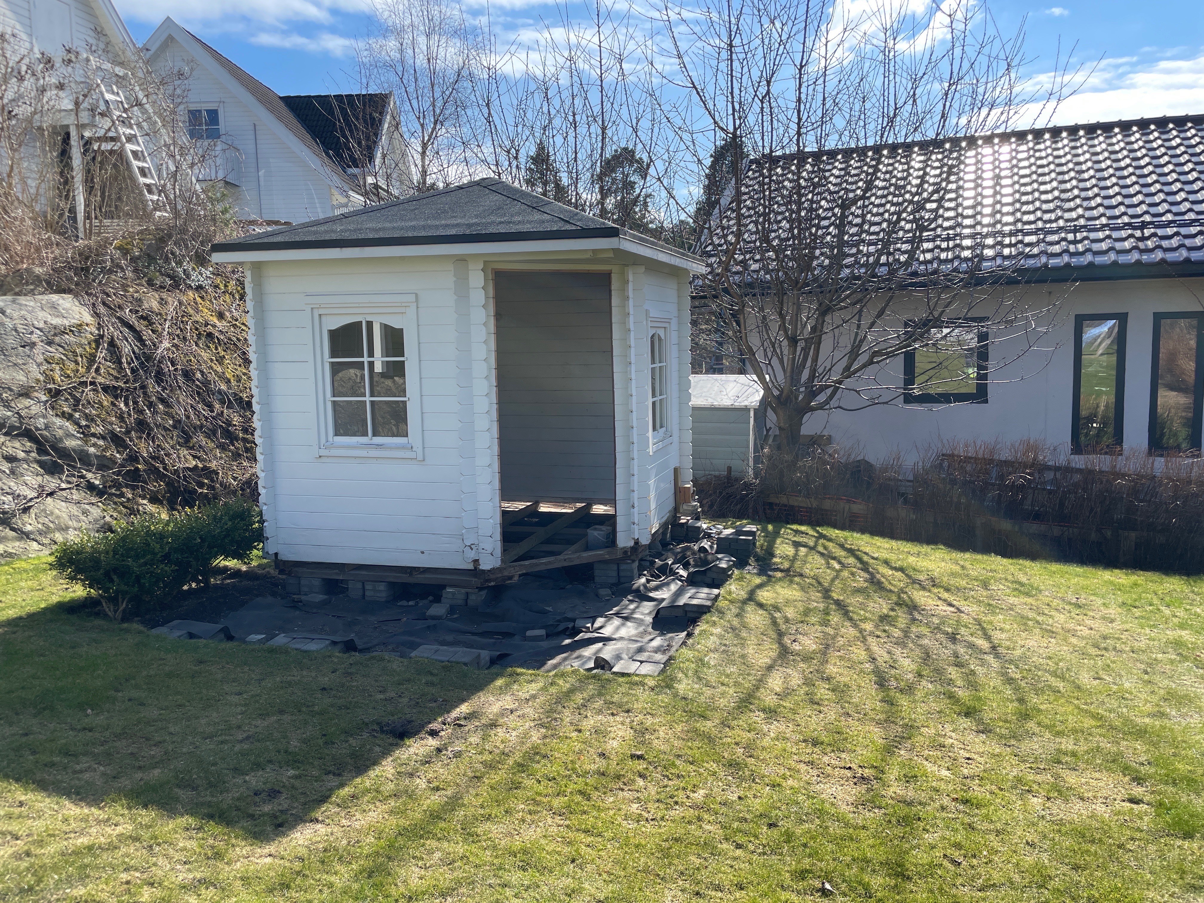 modernist exterior shot a charming small white shed with a classic design stands in a lush vivid green garden the shed has a quaint inviting appearance with soft white walls and traditional windows surrounding this the garden s grass is a vibrant combination of deep emerald and soft mossy greens in the background a serene house with a slate grey roof complements the tranquil scene the sky is a clear bright blue with scattered fluffy white clouds casting gentle shadows on the ground creating a peaceful and idyllic atmosphere the overall mood is serene warm and welcoming evoking a sense of calm and tranquility architecture