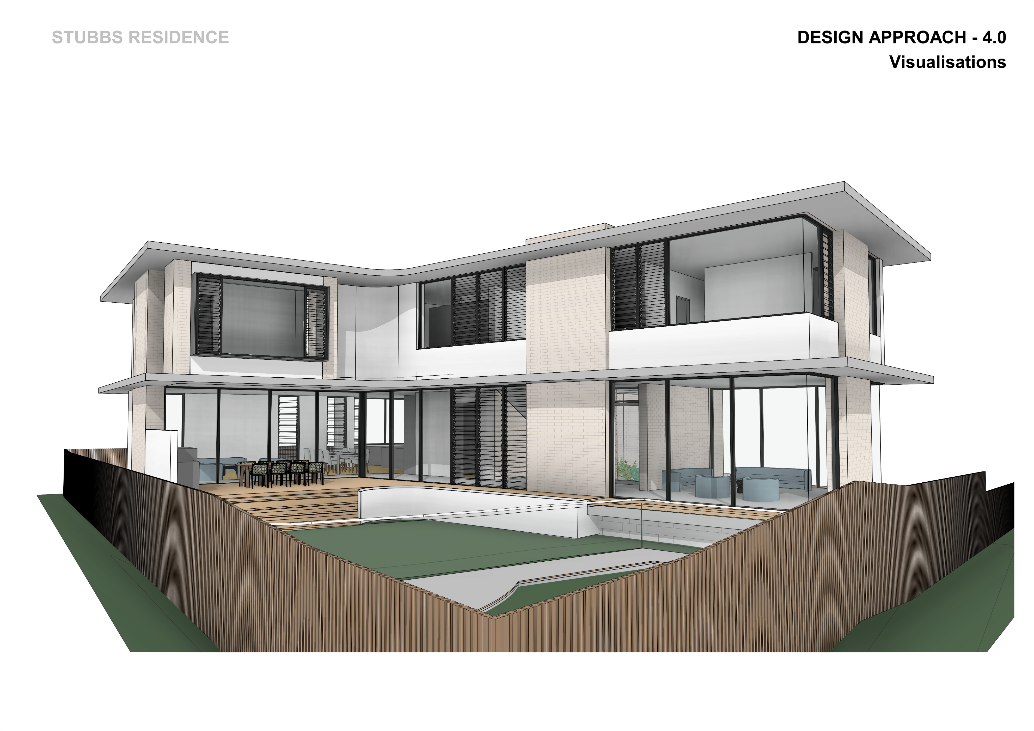 modern two story house with large glass windows and sleek design surrounded by a natural wooden fence the house exterior is clean white render with a light beige brick from krause ghost or similar giving a minimalistic and contemporary look the patio area has stylish timber outdoor furniture and the ground is to be grassed area with a perimeter of lush planting create a serene and inviting atmosphere with soft ambient lighting the sky is a clear soft evening sky and lush greenery surrounds the property adding warmth and life alter the view to be more artistic delete the timber fence line around the house and make the neighbouring planting less don t show any timber fencing around the building