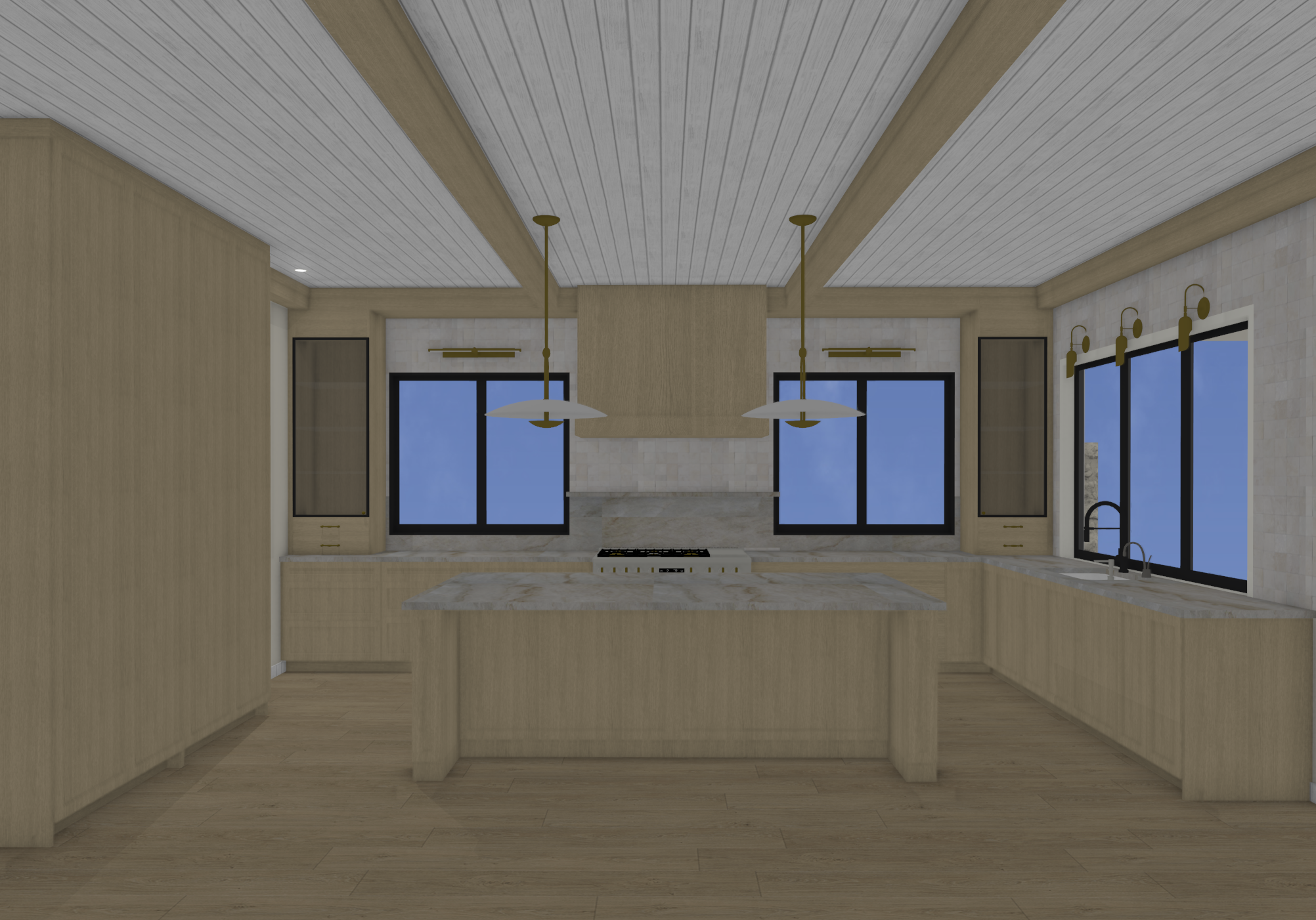 light oak cabinetry ambient dim lighting white plank ceiling