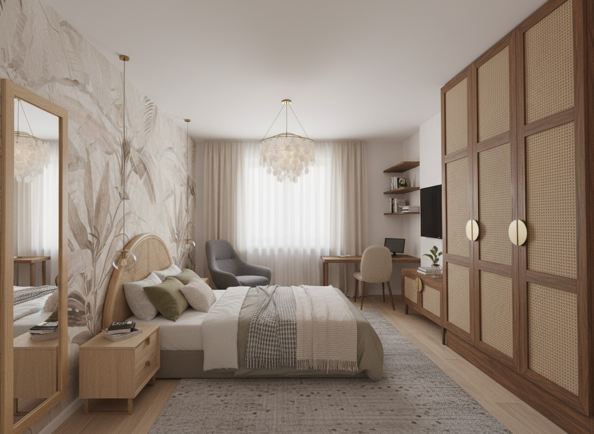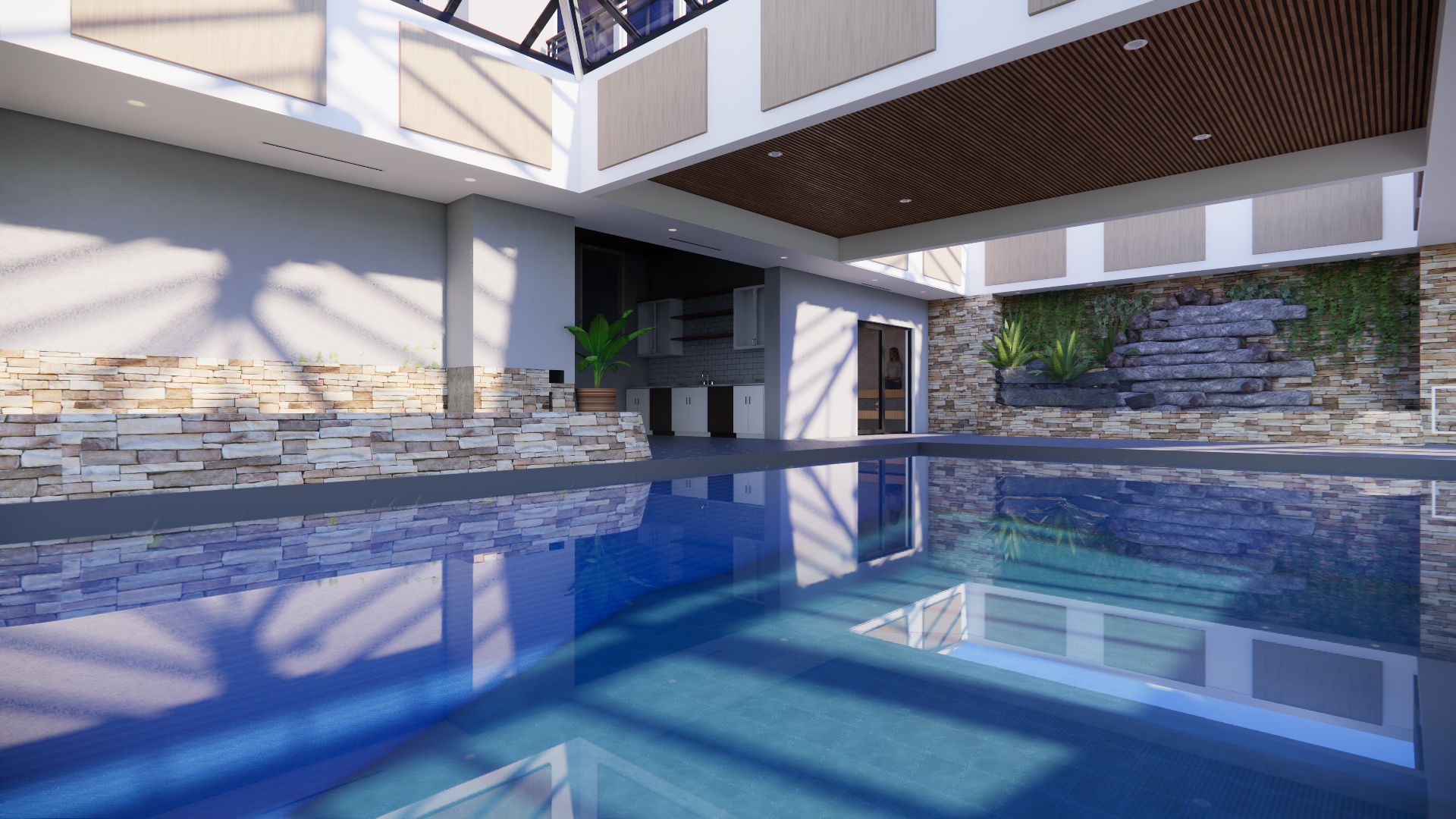 maintain geometry render a serene indoor pool area with large panoramic windows allowing soft natural light to illuminate the space the floor is composed of elegant gray stone tiles that reflect the sunlight the ceiling features warm rich wooden panels creating a cozy atmosphere the walls are clad in a fine white plaster contrasting with warm canvas panels for a modern touch potted plants with lush green foliage enhance the natural feel of the room while distant views of a mountain valley are visible through the glass the overall ambiance is peaceful and inviting perfect for relaxation and leisure