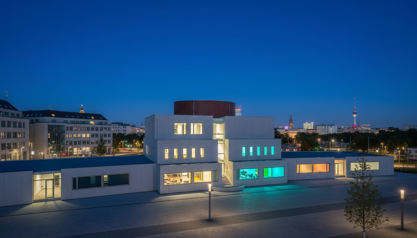 retain the context surrounding landscape and outdoor setting the building mass is a simple rectangular prism with slightly softened edges and corners allowing the geometry to flow continuously across all faces including corners and roof no sharp rigid edges the architectural building is wrapped in a continuous fluid wave pattern that wraps the roof and fa ade the pattern is a continuous wave that flows from one end to another the curved part of the wave protrudes in and out like a computationally designed fa ade material of the wave pattern is irregular solid and transparent glass thathas pale blue tones with subtle reflections light diffusion and internal glow allowing light to pass through realistically the ground floor is recessed creating a shadow gap so the building appears to float above a transparent base the recessed level includes glass curtain walls the fa ade begins above this recessed plinth level remove all excess circular perforations remove domes and skylights surroundings include a landscaped public plaza soft greenery pathways and people for scale style highly realistic architectural visualization clean minimal contemporary parametric design language