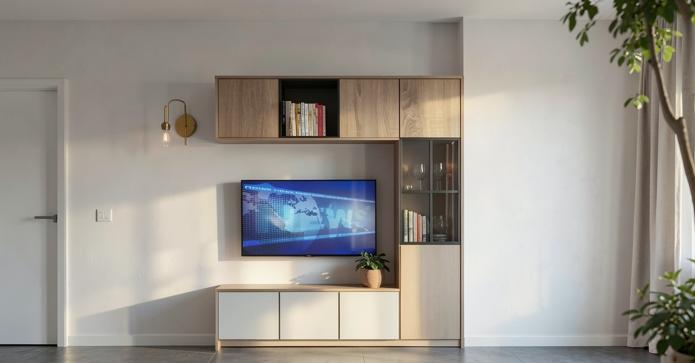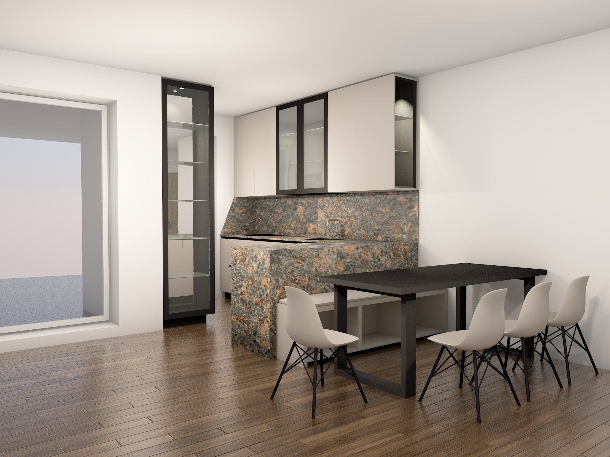soft white modern kitchen kitchen realistic render high detailed add kitchen accesories black frame of the glass cabinets glass inner shelves mirror on the end of glass cabinets
