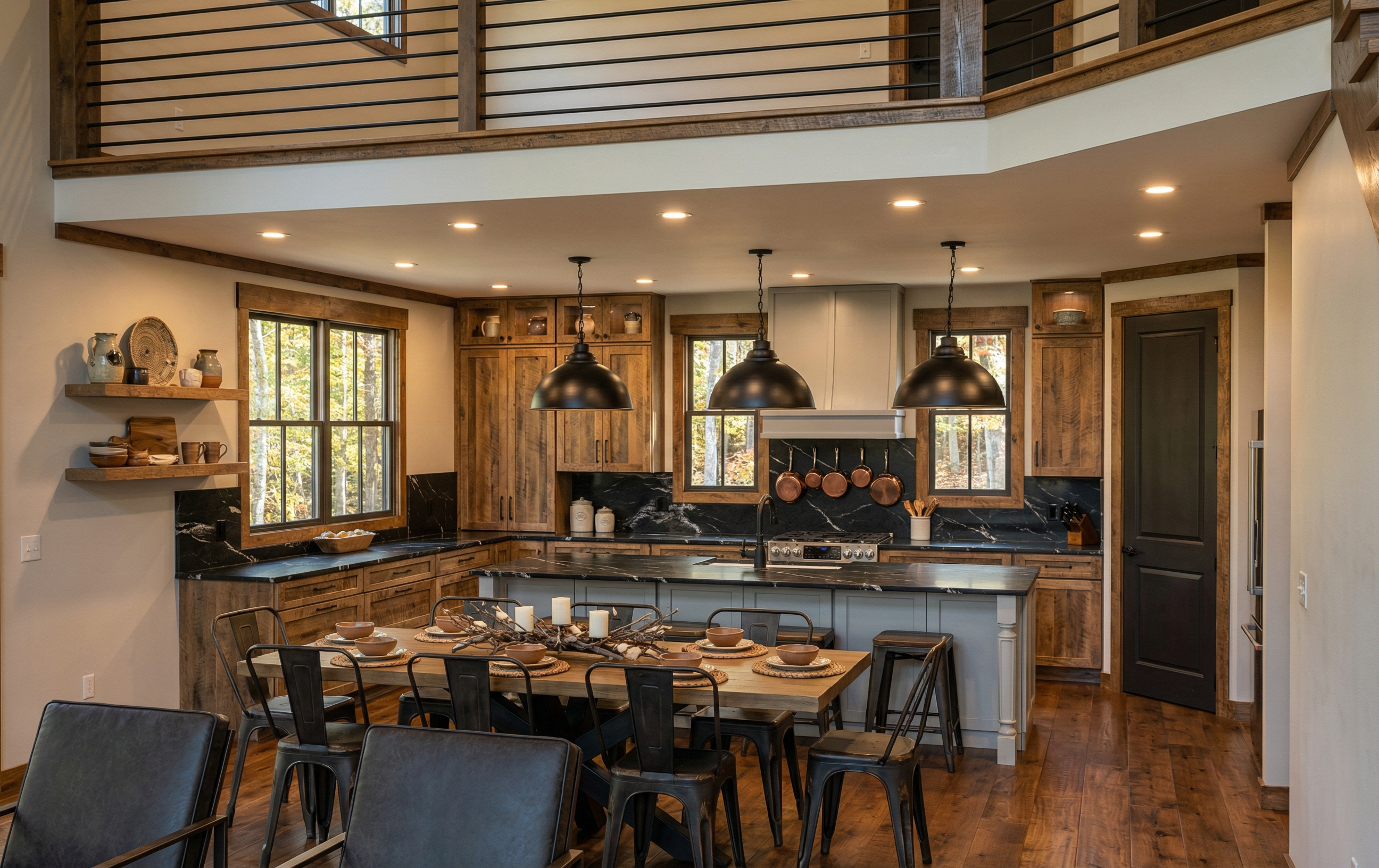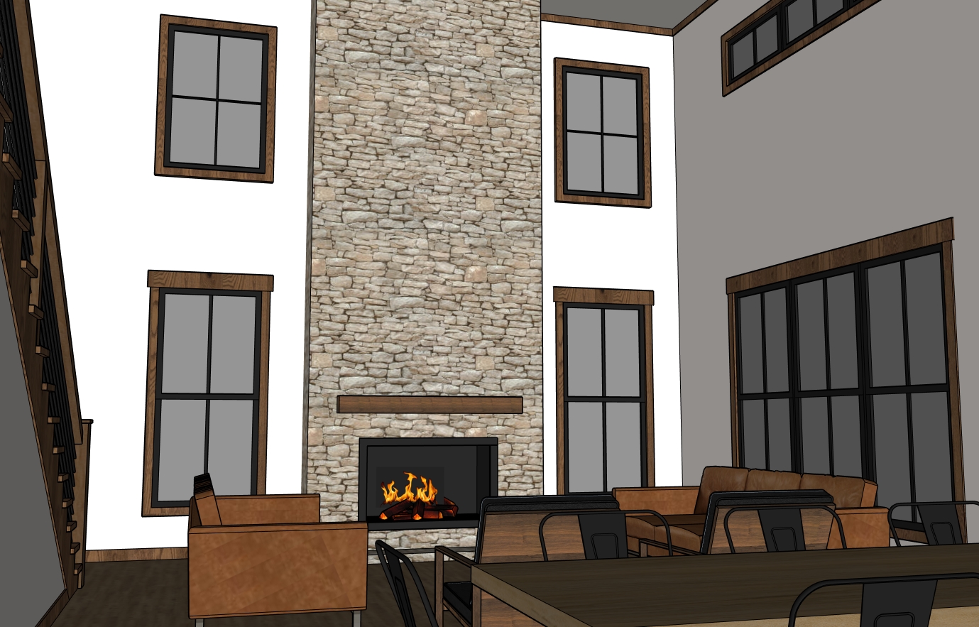 make realistic stage with decor wooded lot outside windows add can lighting modern rustic theme place tv above mantle