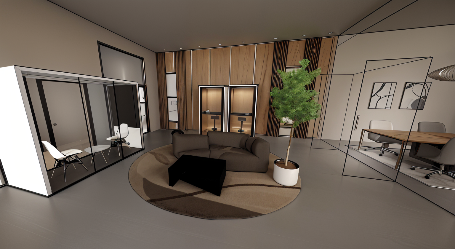modern living room interior spacious and refined walls in soft white for a clean airy feel large windows with minimalist frames light gray for a sleek touch plush sectional sofa in warm taupe inviting and comfortable dining area with elegant white chairs and a glass table reflecting sophistication flooring in smooth cool grey tiles adding contemporary flair media wall in deep charcoal with a large flat screen tv displaying serene landscape imagery shelving with subtle decor potted lush greenery for a fresh accent natural daylight streaming in creating a calming warm atmosphere architecture