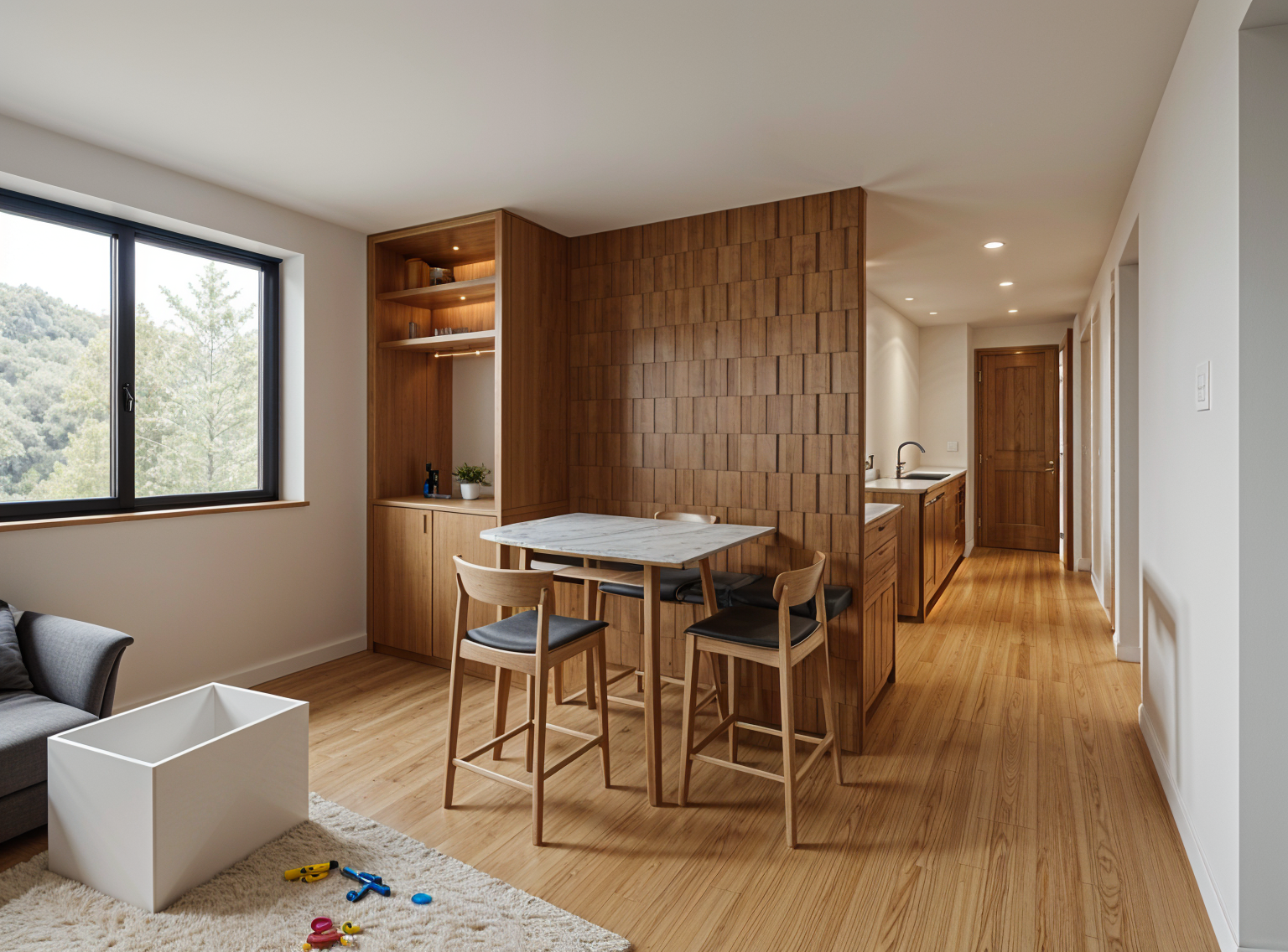 render a modern minimalist open plan living and kitchen space the room features light oak wood flooring and furniture including a partition wall with a geometric pattern the walls are a crisp white enhancing the airy feel the chairs have deep burgundy cushions adding a touch of elegance a sleek neutral colored sofa is placed by the window which lets in abundant natural light the atmosphere is warm and inviting with a blend of scandinavian and contemporary elements kitchen in the schrank