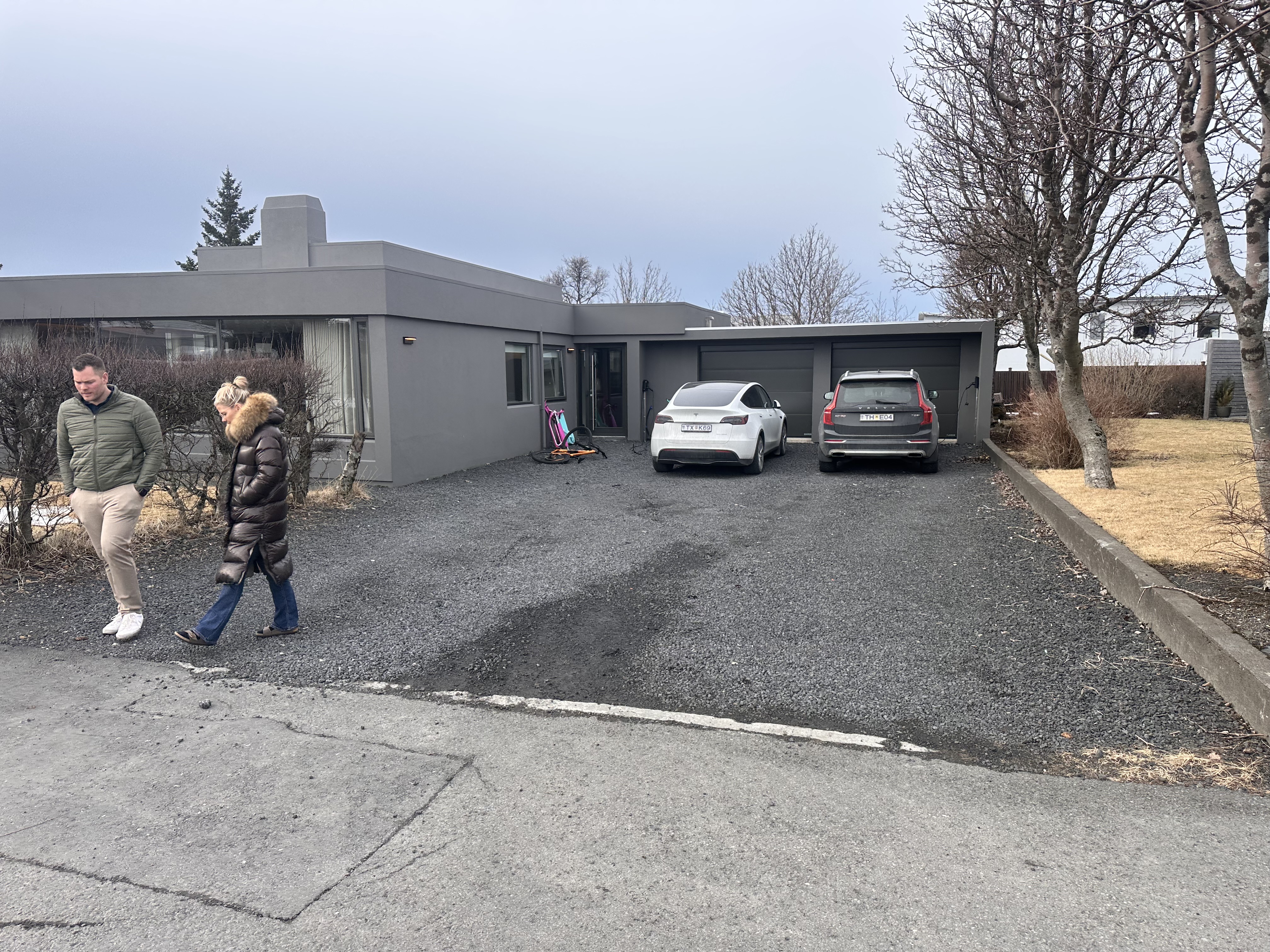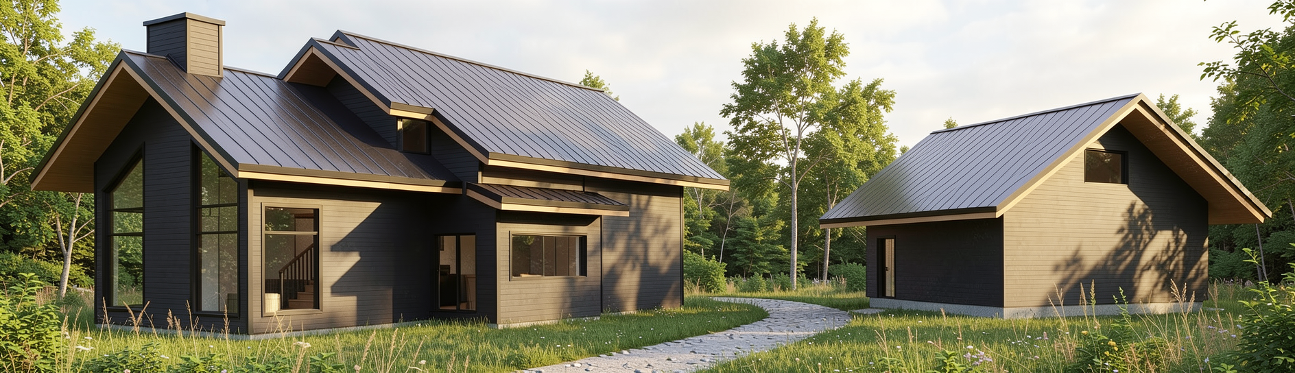 replace the black gravel with high quality grey stone pavers and add architectural grasses in minimalist planters along the edge keep the grey house but add a warm wood slat fence on the right side