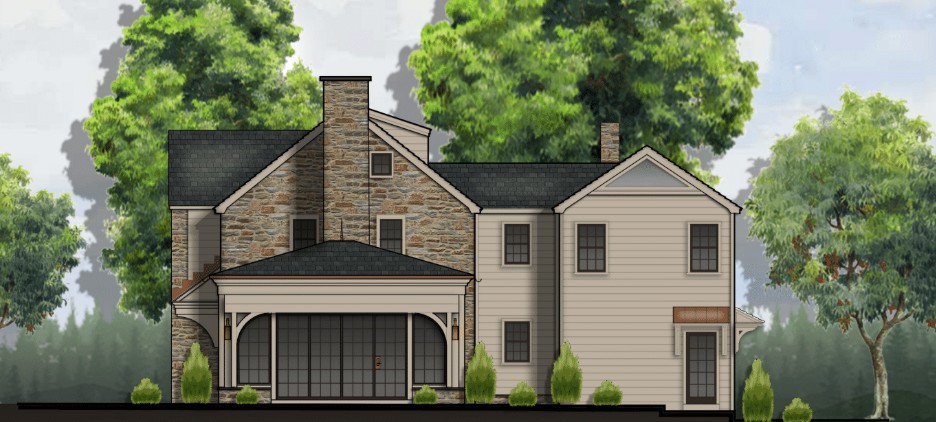 ultra realistic photograph of a traditional stone country house with natural fieldstone masonry with realistic texture variation and brown tones and taupe siding black window and door sashes multi pane windows with subtle reflections dark slate roof on second floor with consistent coloring copper roof over front door covered porch with arched windows and glass door triangular window in gable manicured shrubs and landscaping mature trees in the background soft natural daylight realistic shadows accurate proportions architectural photography dslr photo 35mm lens shallow depth of field global illumination high dynamic range ultra detailed 8k realism true to life materials cinematic yet natural color grading
