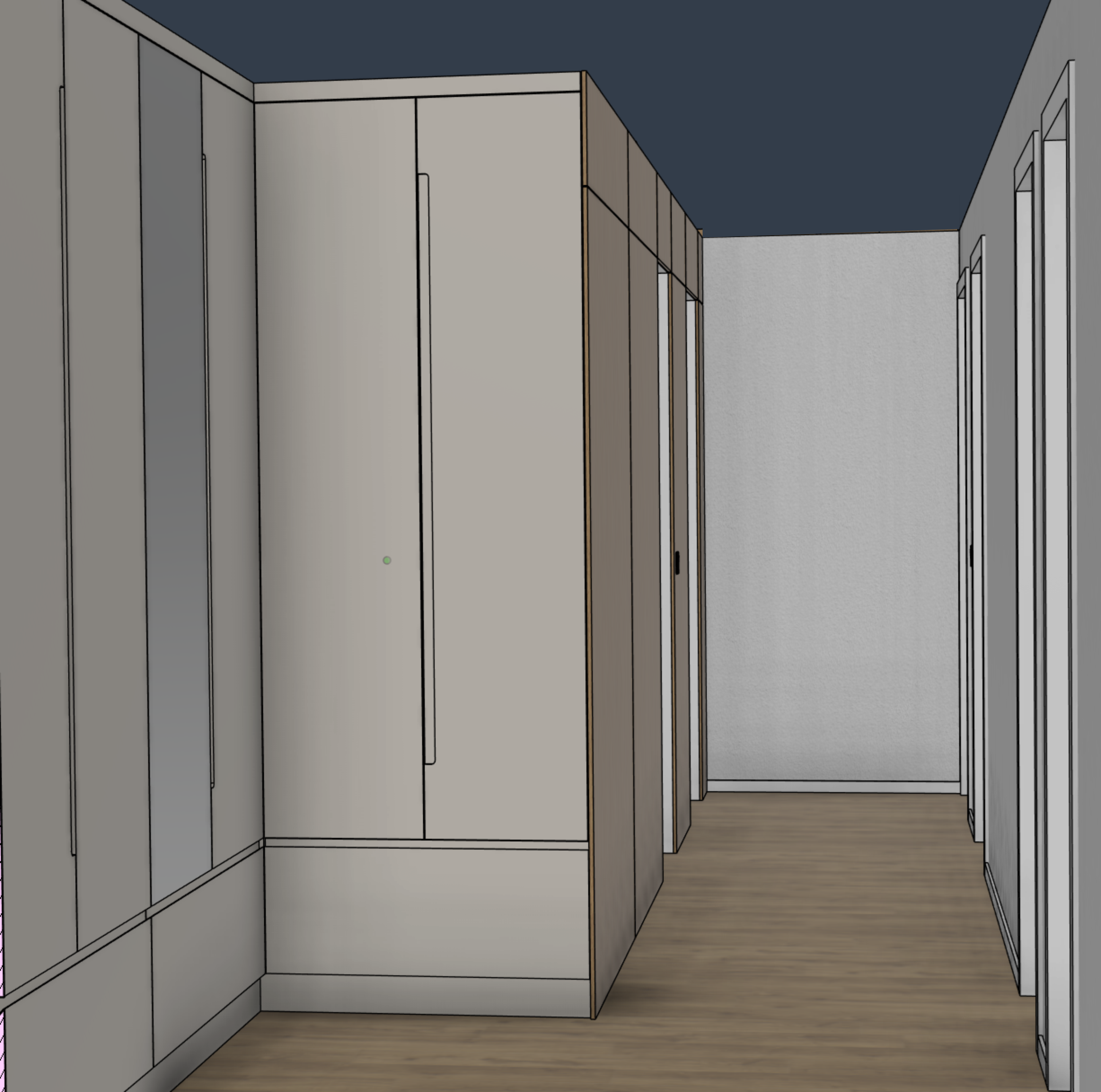 use the provided screenshot strictly as the base image keep the exact camera angle layout proportions wall positions door positions and furniture placement do not change the architecture or geometry convert the scene into a highly realistic render of a modern minimalist apartment hallway on the right side there is a continuous built in wardrobe the wardrobe doors are in a chalk color soft warm off white matte finish with long vertical integrated handles one of the wardrobe doors contains a full height mirror panel integrated into the wardrobe front next to the wardrobe the brown vertical element is a wall cladding panel made of natural oak wood the oak has a calm subtle grain with a soft radial pattern elegant and not overly rustic the wood tone is warm natural oak the floor is natural oak wooden flooring slightly lighter than the oak wall panel use long planks with a matte finish and subtle wood grain the interior doors visible in the corridor are pure white with a smooth matte finish minimal modern design walls are smooth white plaster with a soft matte texture lighting should be natural and soft coming from daylight spilling in from the adjacent rooms combined with subtle warm interior lighting to create a pleasant residential atmosphere use realistic global illumination soft shadows and physically accurate materials do not add or remove furniture or architectural elements