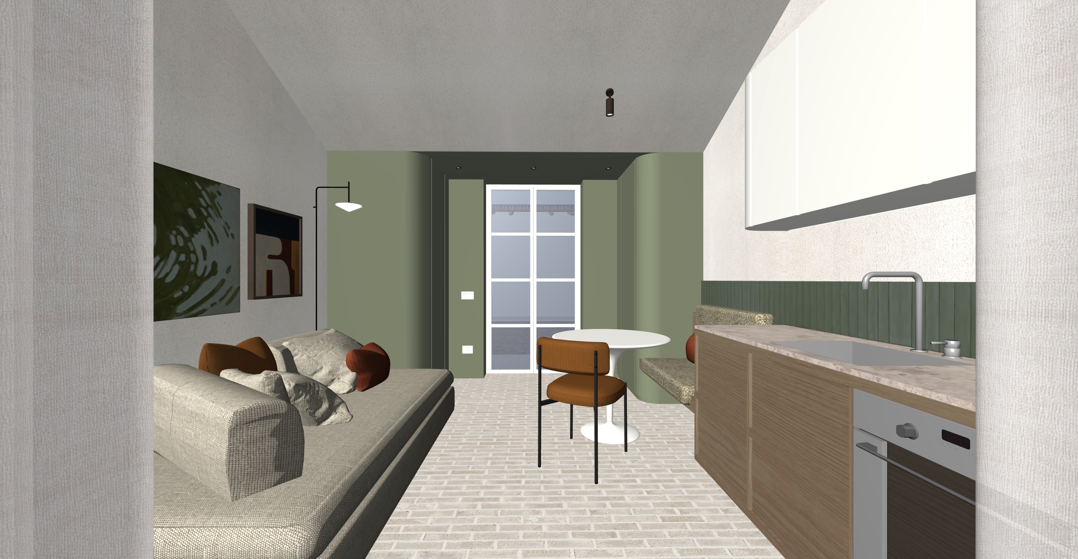 le pareti sono intonacate bianco caldo mantieni tessuto divano aggiungi strip led sotto pensile cucina lavabo e rubinetto in acciaio spazzolato tavolo laccato bainco opaco