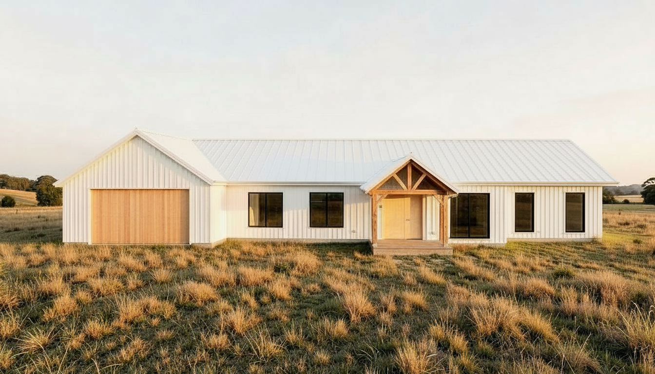 modernist exterior shot update the existing home design to feature a multi gabled roofline with three prominent front facing gables each gable should have a steep pitch modern farmhouse style evenly spaced across the facade to create symmetry and depth include a central entry gable with a slightly lower pitch extending over a covered porch supported by exposed timber posts roof material to be dark charcoal shingles or colorbond style metal ensure strong vertical emphasis with clean lines simple trims and minimal overhangs maintain a balanced cohesive elevation with layered roof forms and consistent proportions architecture