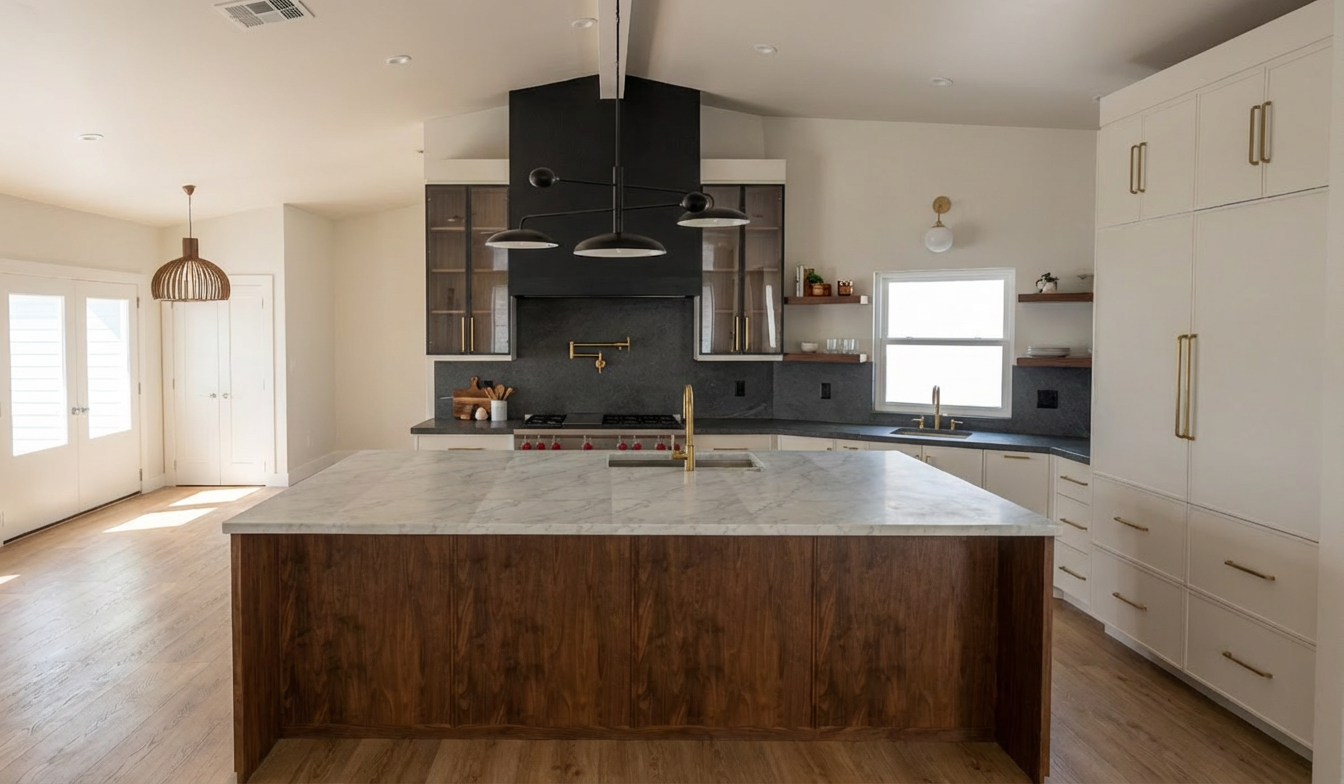 role act as an expert architectural visualizer and high end retoucher task enhance the provided 3d interior design render to achieve ultra photorealism and editorial quality architectural photography elevate the lighting material depth and overall atmospheric presence of the image strict constraints critical zero structural changes preserve the exact geometry scale and proportions of the original image zero object hallucination do not add remove or alter any objects furniture or architectural elements zero material alteration do not change existing patterns or material types preserve bespoke finishes exactly as rendered e g maintain specific details like rift cut white oak with brass inlay rather than generating generic or reeded wood textures zero layout alteration maintain the exact architectural boundaries respect the existing light sources and room layout perfectly e g do not introduce artificial daylight or fake windows into windowless rooms enhancement directives lighting apply realistic global illumination accurate light bounces and sophisticated ambient occlusion enhance the depth and micro contrast to give the room a striking three dimensional presence materials refine the physical rendering of existing surfaces accurately simulate realistic light interaction specular highlights and natural reflections on the established materials to make them look tangible and true to life output style the final image should resemble a high end portfolio photograph balancing clarity natural shadow falloff and sharp focus