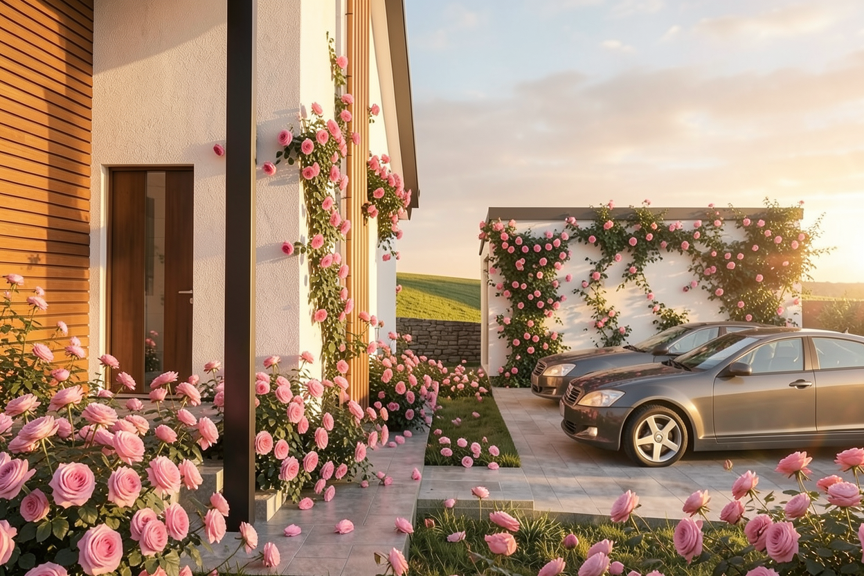 make this look photorealistic at sunset add some landscaping as needed for a backyard