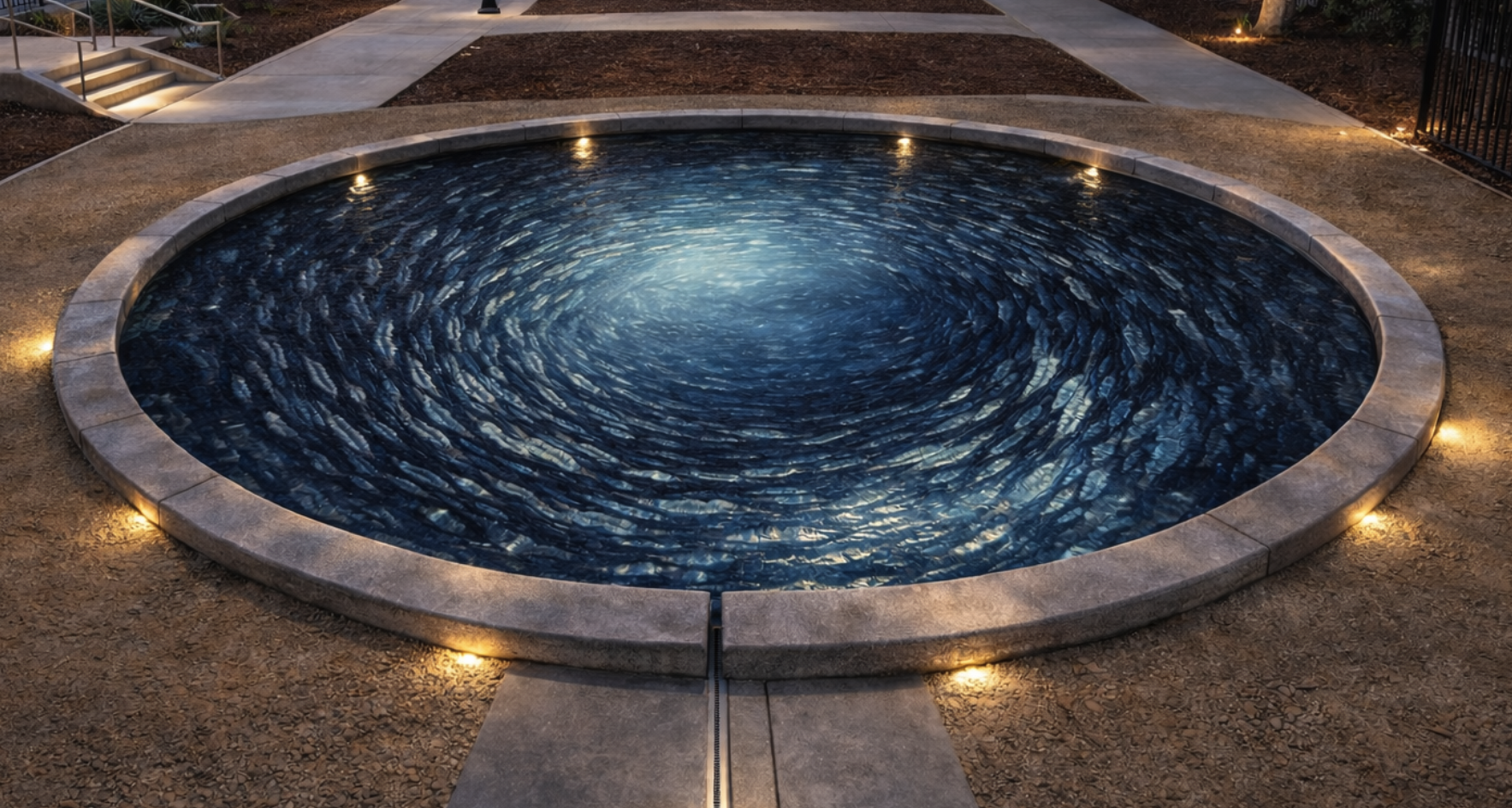 can you make a more deep green color add a middle sculpture that is metal and looks like a group of fish swimming in a circle can you add a few fish looking like they are half in and half out of the mosaic at the bottom of the pond