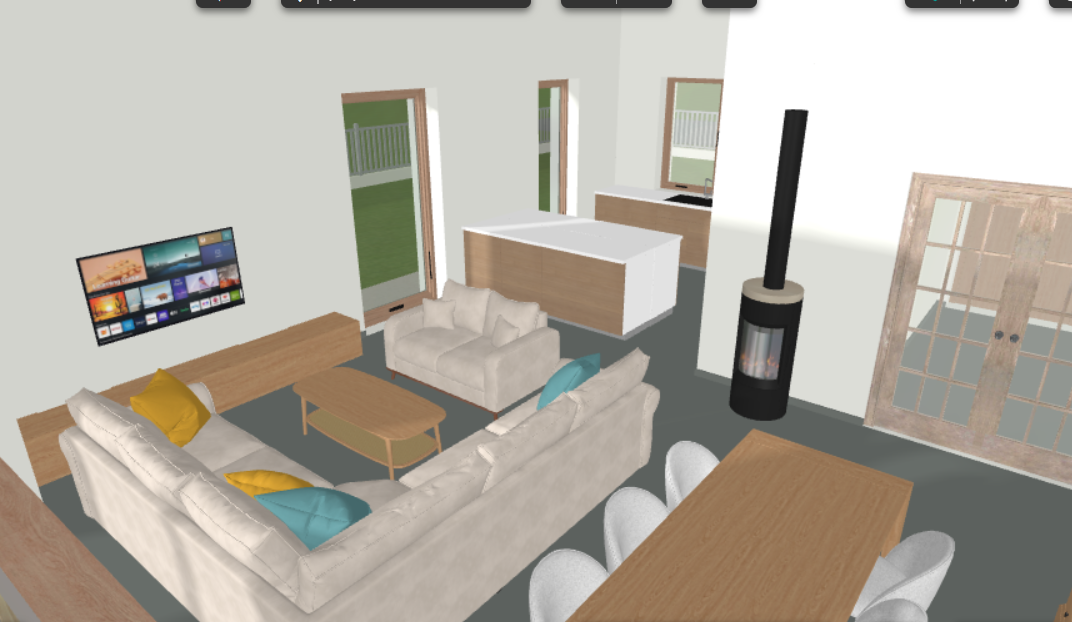 floor lighter oak in a herringbone pattern kitchen natural oak veneer white countertop the other furniture and doors also in natural oak veneer dining table in solid wood handles and similar hardware should be silver brushed stainless steel add scandinavian style pendant lights above both the coffee table and the dining table simple minimal designs