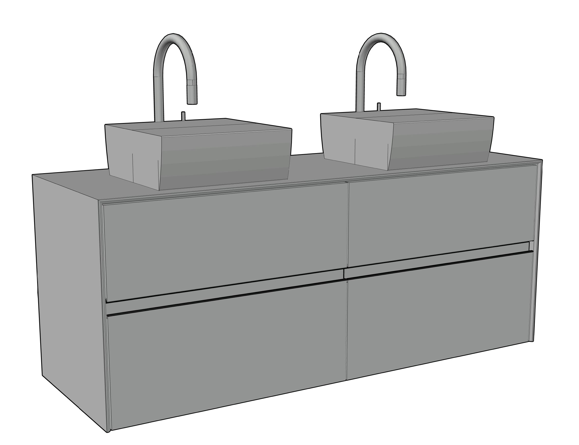 fotorealistisches makro rendering eines modernen badezimmer waschtischs high end magazin stil extreme nahaufnahme der vorderkante einer gl nzenden keramikplatte in taj mahal optik warme beige naturstein marmorierung feine adern realistische reflexionen die kante ist das zentrale designelement oben eine pr zise gerade fl che darunter eine klar definierte schr ge fase mit scharfem knick dieselbe kanten geometrie setzt sich nahtlos an den linken und rechten seiten fort wobei auch die seitenverkleidungen vollst ndig aus derselben gl nzenden taj mahal keramik bestehen oben auf der platte stehen zwei identische minimalistische aufsatzwaschbecken aus der kollektion nubes 38x38 cm mit weichen organischen rundungen d nnwandiger ausf hrung und perfekt glatter gl nzend wei er keramikoberfl che die becken wirken leicht und skulptural mit sanft gerundeten kanten und pr ziser geometrie weiches seitliches studio licht erzeugt feine lichtreflexe auf allen kantenfl chen sowie auf den geschwungenen beckenformen und betont die durchgehende geometrie unterhalb der platte sind leicht unscharf matte fronten in kaschmir supermatt samtige oberfl che keine reflexionen sichtbar sehr geringe tiefensch rfe fokus exakt auf der kante im vordergrund w hrend die becken leicht in den hintergrund bergehen im hintergrund dezentes bokeh mit angedeuteten mattschwarzen armaturen jeweils passend zu den beiden becken neutraler studio hintergrund ruhige high end sthetik ultrarealistische materialien physikalisch korrektes licht keine cgi anmutung