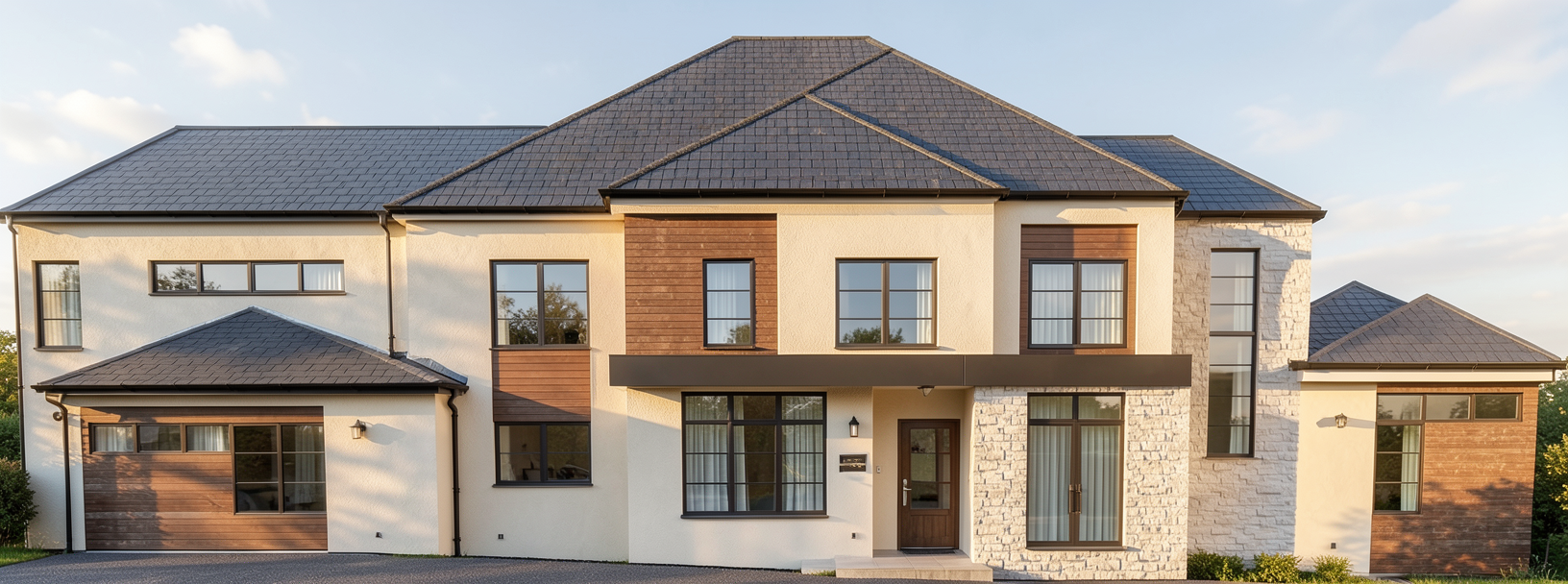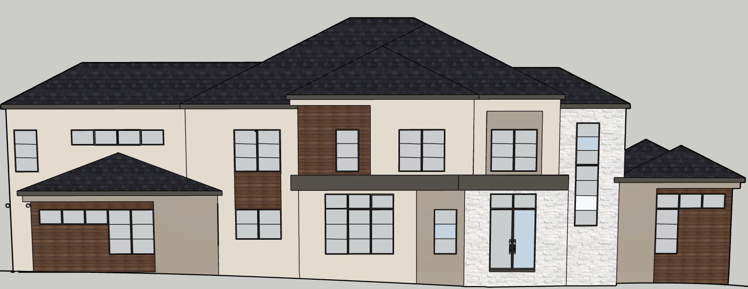render a modern two story house with a sleek minimalist design the exterior walls are a soft beige color with warm brown wooden panel accents the roof is covered with dark charcoal gray shingles adding a subtle contrast the garage doors are a rich wood tone complementing the wooden panels large windows with black frames punctuate the facade allowing natural light to illuminate the interior a white stone feature wall enhances the modern aesthetic the front door is sleek and contemporary with a light blue tint on the glass the atmosphere is serene and sophisticated set under a clear blue sky with sunlight casting soft shadows