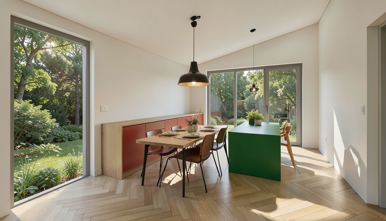 modernist exterior shot a modern bedroom with a sleek minimalist design the atmosphere is serene and calming the walls are a soft beige the large window lets in natural light casting a warm glow the bed has a luxurious white comforter with subtle grey stripes and plush pillows the side table and armchair are in a rich burgundy red adding a touch of elegance the floor is a light wooden hue a large vibrant green plant in a cream colored pot sits beside the window enhancing the natural feel the overall mood is peaceful and inviting architecture