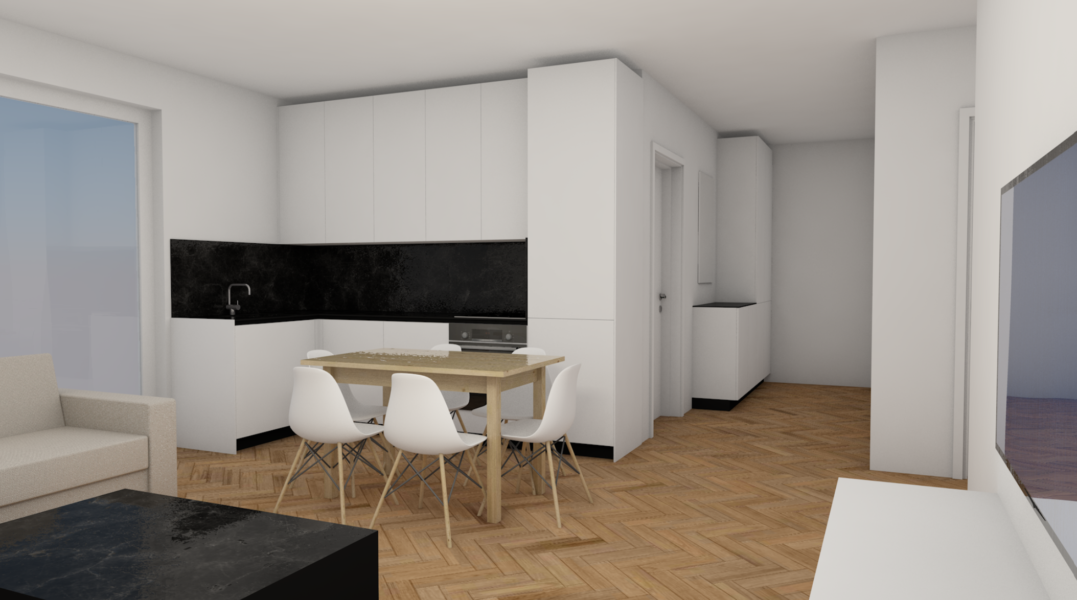 modern minimalist loft soft colors change the dining table and chais accesories more realistic close the area between furniture and ceiling
