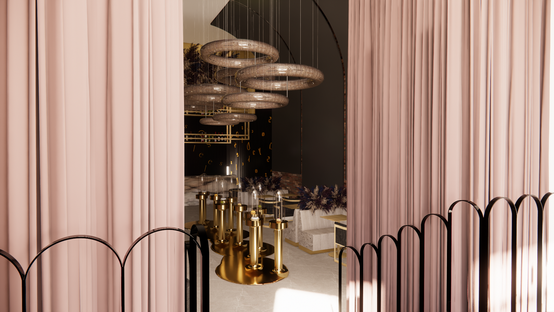 add graphic of a sunset gradient on a grey curve create the image all the way to the top of the grey arch don t change any furniture and don t add anything just a gradient sunset image on a grey curve arc
