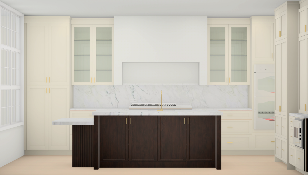 make more photo realistic glass will have ribbed texture make double wall ovens thermador brand make floors more of a warm white oak keep countertop the same on lower table make countertops and backsplash taj mahal quartzite