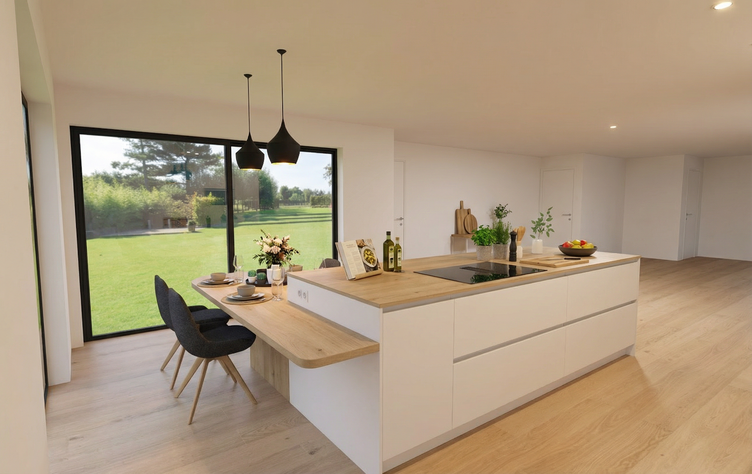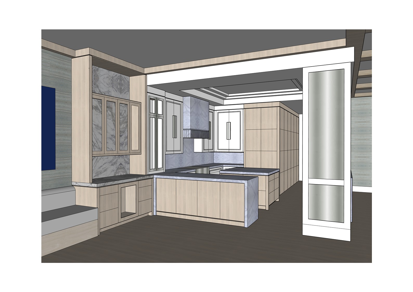 transform the provided elevation into a hyper realistic interior photograph that is indistinguishable from a real professionally shot interior design photograph this must read as a real space captured by a camera not a rendering not a visualization not architectural cg not concept art and not an illustration geometry lock non negotiable preserve the exact original geometry layout proportions ceiling details wall depths panel divisions openings doors cabinetry locations millwork dimensions built ins and circulation paths with zero architectural changes nothing may move scale simplify or be reinterpreted geometry must remain absolutely unchanged camera derivation critical derive the camera position height angle and framing strictly from the uploaded elevation eye level interior photography centered or naturally balanced composition 24 35mm interior lens feel no dramatic angles no stylized framing do not reuse or approximate camera framing from any previous image remove all drawing artifacts completely remove all linework cad edges drafting outlines diagrammatic shapes sketch artifacts nothing may appear outlined flat schematic or illustrative the elevation must be visually reinterpreted as a finished real interior photograph material realism rules wood if present smooth solid plank material extremely subtle restrained grain matte or soft satin finish only no graphic patterns no decorative striping no visual noise wood must absorb light gently never glossy or sharp fabric upholstery if present soft compression subtle seams gentle shadowing natural fabric texture no flat color blocks stone slabs if present light natural veining soft organic variation low contrast no symmetry no bold or busy patterns stone must feel heavy and grounded walls fine surface texture slight tonal variation never flat paint edge construction realism all edges corners joints and transitions must be softly broken and physically realistic no razor sharp corners no cgi perfect edges slight construction tolerances only everything must read as fabricated installed and dimensional lighting photographic behavior lighting must behave like real high end interior photography natural daylight only unless otherwise specified realistic light bounce gentle shadow falloff uneven exposure distribution subtle brightness variation across surfaces avoid studio lighting uniform illumination over clean exposure global illumination look slight softness is preferred over sharpness camera image imperfections very important introduce subtle photographic characteristics gentle lens softness micro exposure variation natural contrast roll off mild atmospheric depth primary plane sharp background slightly softer the image must feel captured not generated absolute constraints no creative interpretation no stylization no exaggeration no added or removed elements any deviation from the original elevation geometry or intent is unacceptable negative prompt always include architectural rendering 3d visualization cgi unreal engine octane vray sketchup look flat textures graphic lines outlined edges over sharpened studio lighting concept art illustration ai look plastic materials glossy wood high contrast grain perfect symmetry keep design as shown in the picture keep the design as it is in image light cabinets are white and brown cabinets are white oak keep design in the image as it is including materials