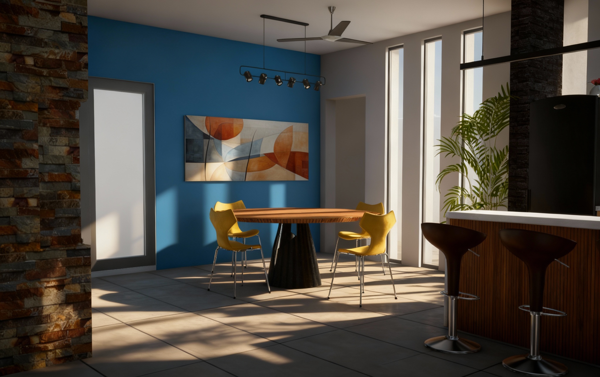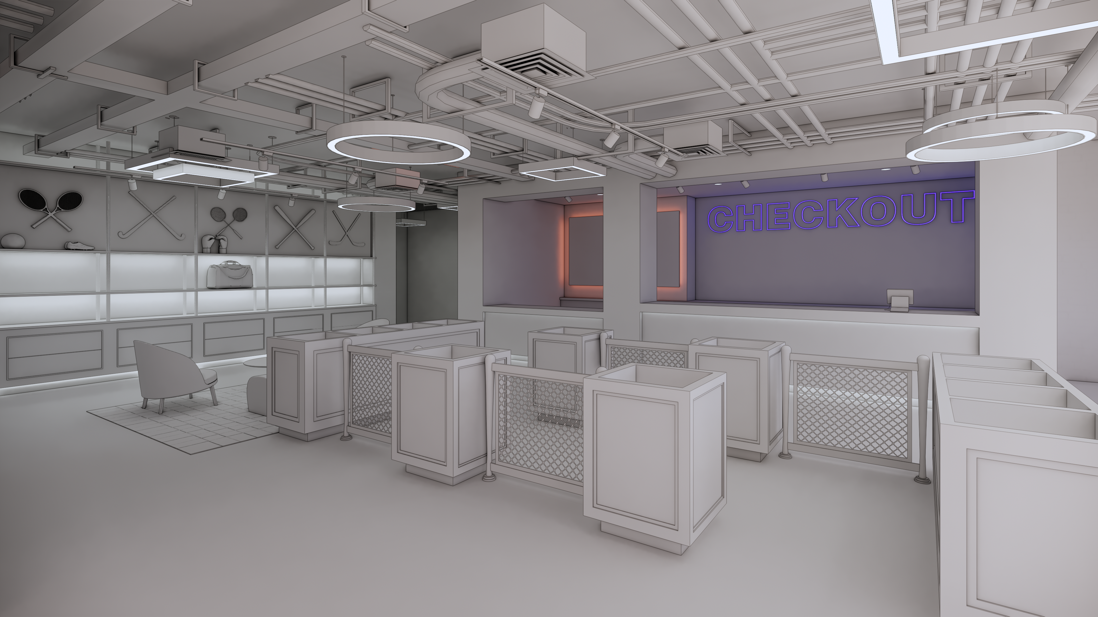 design a clean sculptural retail space with a fully exposed ceiling emphasizing the raw architectural character of the building while maintaining a high end minimal dc sports aesthetic the ceiling should reveal concrete structure ducts and electrical runs but all organized painted and detailed intentionally to feel purposeful rather than industrial all ceiling elements should be sprayed in a uniform warm white or deep charcoal to create a clean monolithic plane above the space integrate ultra linear led lighting that slices across the exposed structure like arena tunnel lighting precise controlled and minimal walls should remain crisp white or soft gray to feel gallery like avoid any mesh use smooth solids architectural planes and controlled pops of dc team inspired color through thin back painted glass bands or led accents retail fixtures should be monolithic matte black steel frames engineered stone or solid surface plinths and integrated lighting that elevates merchandise the overall feeling should be architectural confident and minimal like a modern gallery merged with a premium sports arena store grounded in dc monument inspired geometry