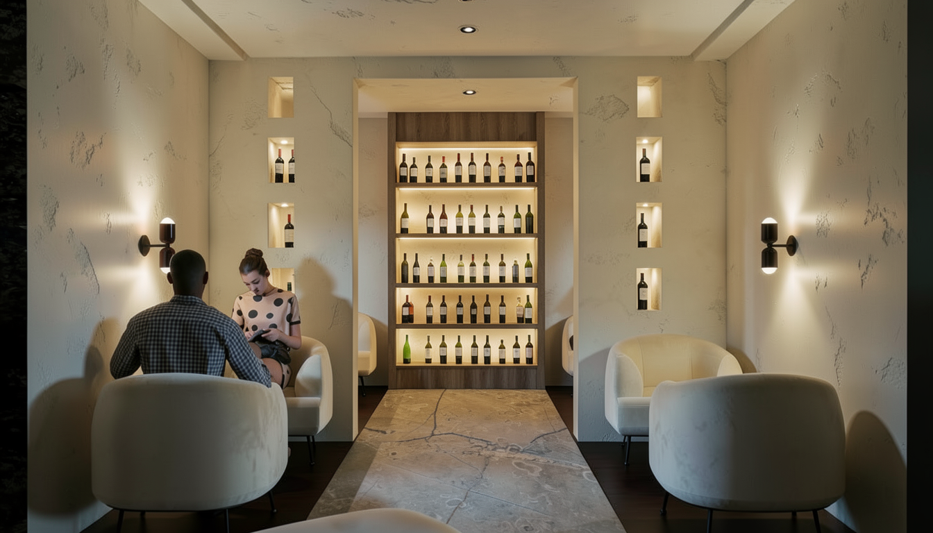 intimate wine lounge seating alcoves with cream velvet lounge chairs warm plaster walls with subtle limewash texture and tonal variation small wall niches each displaying a single wine bottle with soft warm pin lighting central back wall shelf displaying wine bottles with very soft warm backlighting creating a gentle glow through the bottles carved stone floor path with subtle wear patterns from circulation dark wood floor in seating areas warm wall sconces creating soft pools of light overall ambient lighting slightly cooler to balance the warm lights cinematic lighting with warm highlights and cool shadows natural material variation lived in atmosphere quiet luxury moody architectural visualization photorealistic materials interior elevation view straight on perspective no change to architecture or layout film still