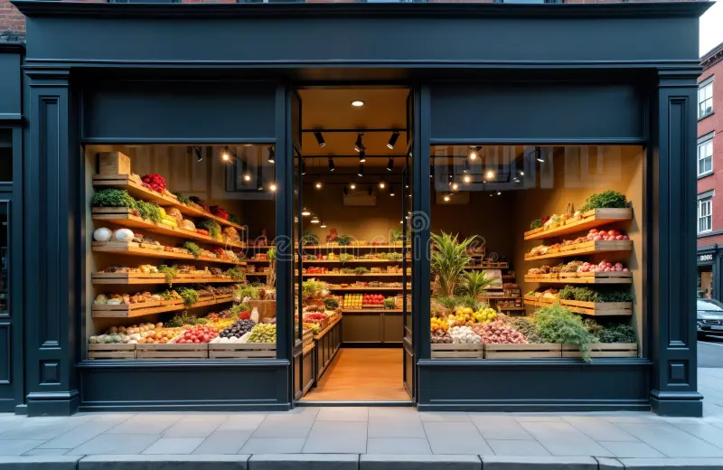 exterior shot interior to be a specialty food shop displaying fresh produce