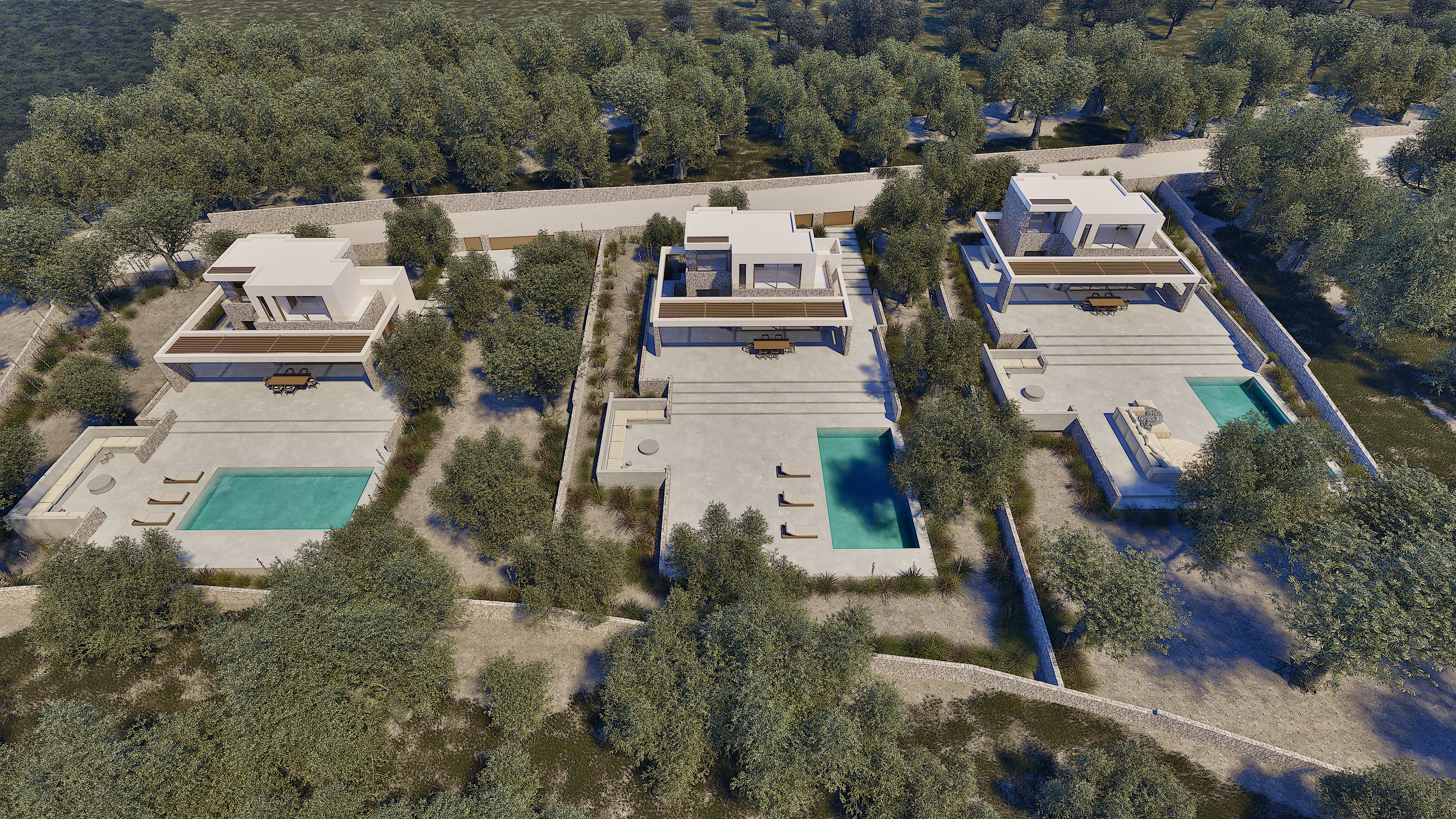 aerial shot aerial shot with natural early morning soft light olive trees and mediterranean vegetation architecture
