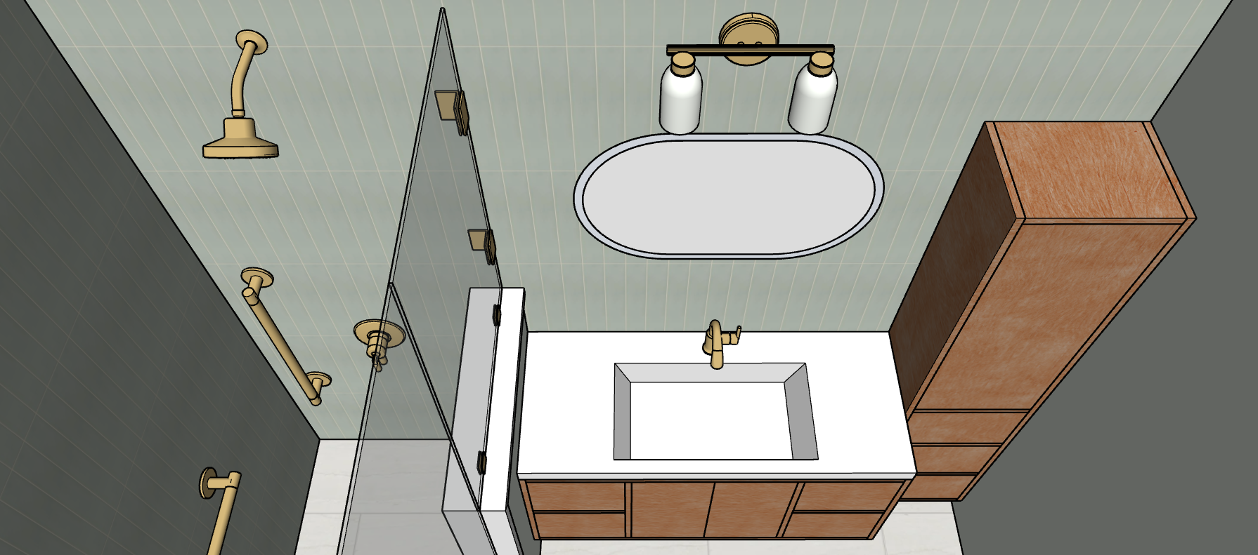 tile has a mint color with light variations lighting comes only from the vanity light with semi transparent scones 3500k and mirror backlighting the mirror on the right wall has a soft white backlit halo 3500k evenly diffused there is no sunlight nor any light source other than the vanity light and backlit mirror overall scene is evenly brightened using neutral 3500k lighting only do not add highlights glow reflections or new light sources the shower head and all shower fixtures are not light sources and emit no light no lighting exists within the shower or niche